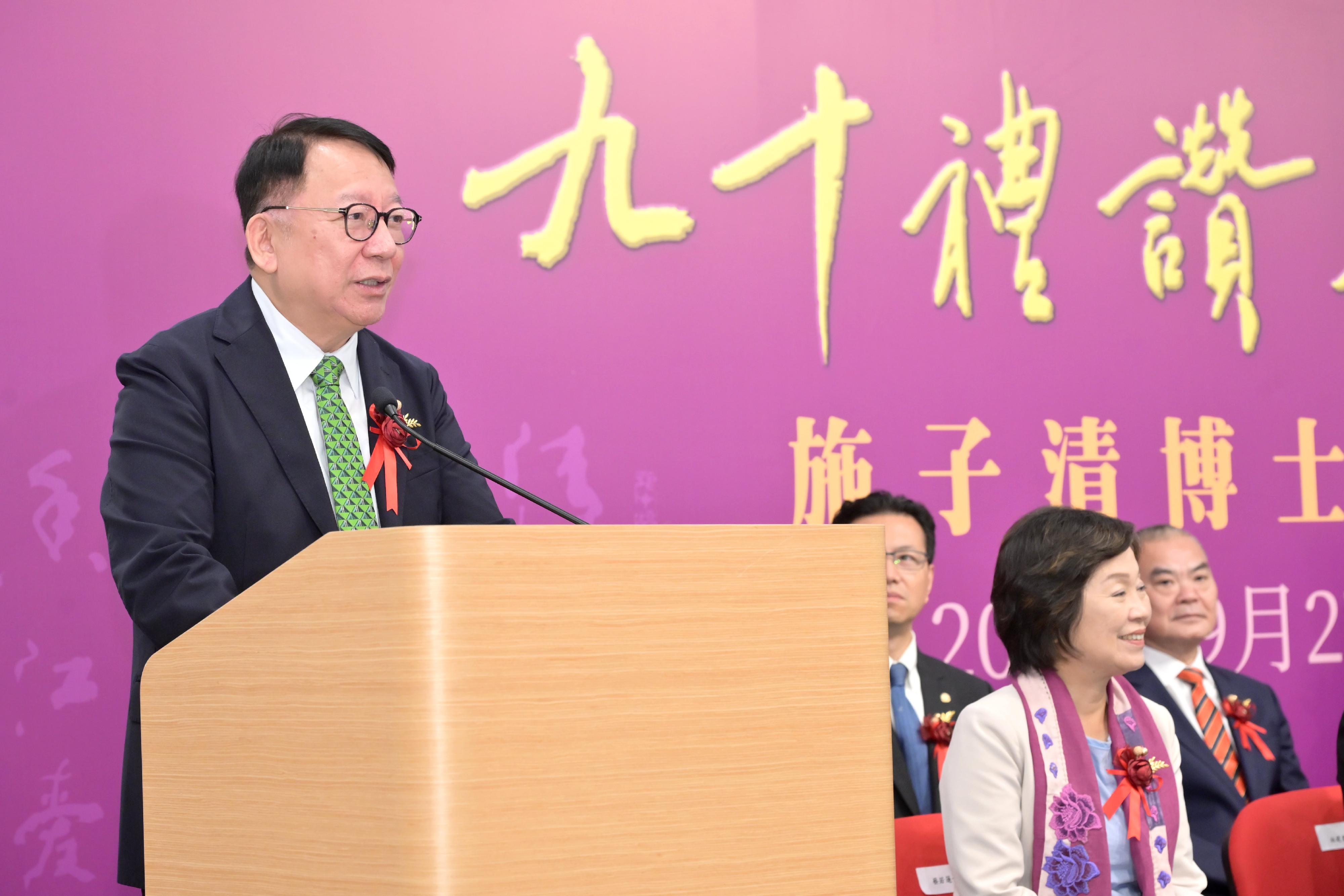 蘇士澍致辭時表示,施子清先生七歲清水寫磚,九十載寸管為舟墨海揚帆,他在書藝的成就登峰造極,固然值得我們學習;他的奮鬥人生、擇善固執與責任擔當,更是我們的楷模。其書法之路,非泛泛之輩僅為閒情逸致的消遣,實乃發自內心深處對中華文化的自覺承繼與傳播弘揚;又升華為將個人喜好與家國情懷、責任擔當緊密相連,勠力為香港開拓一方淨土。
