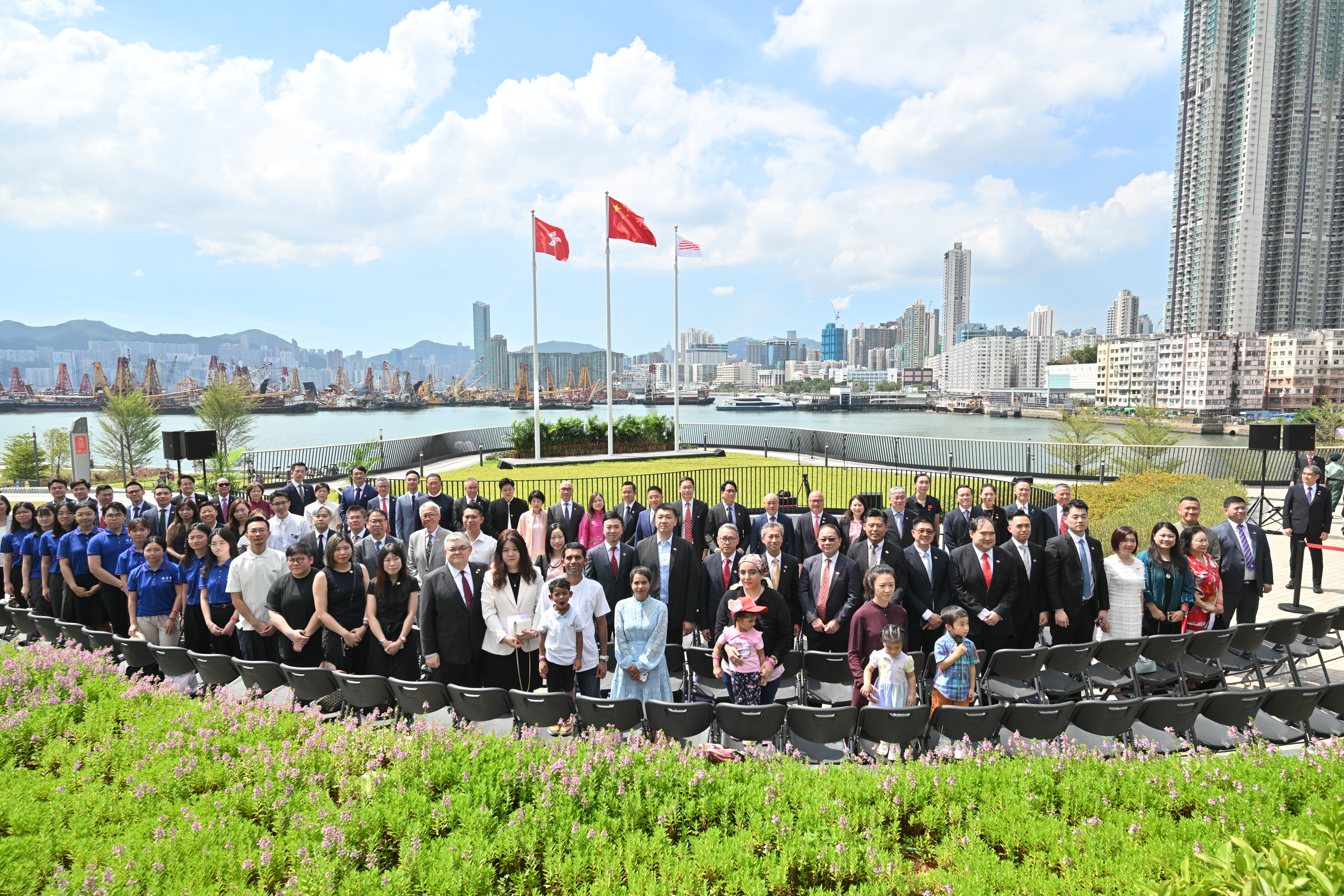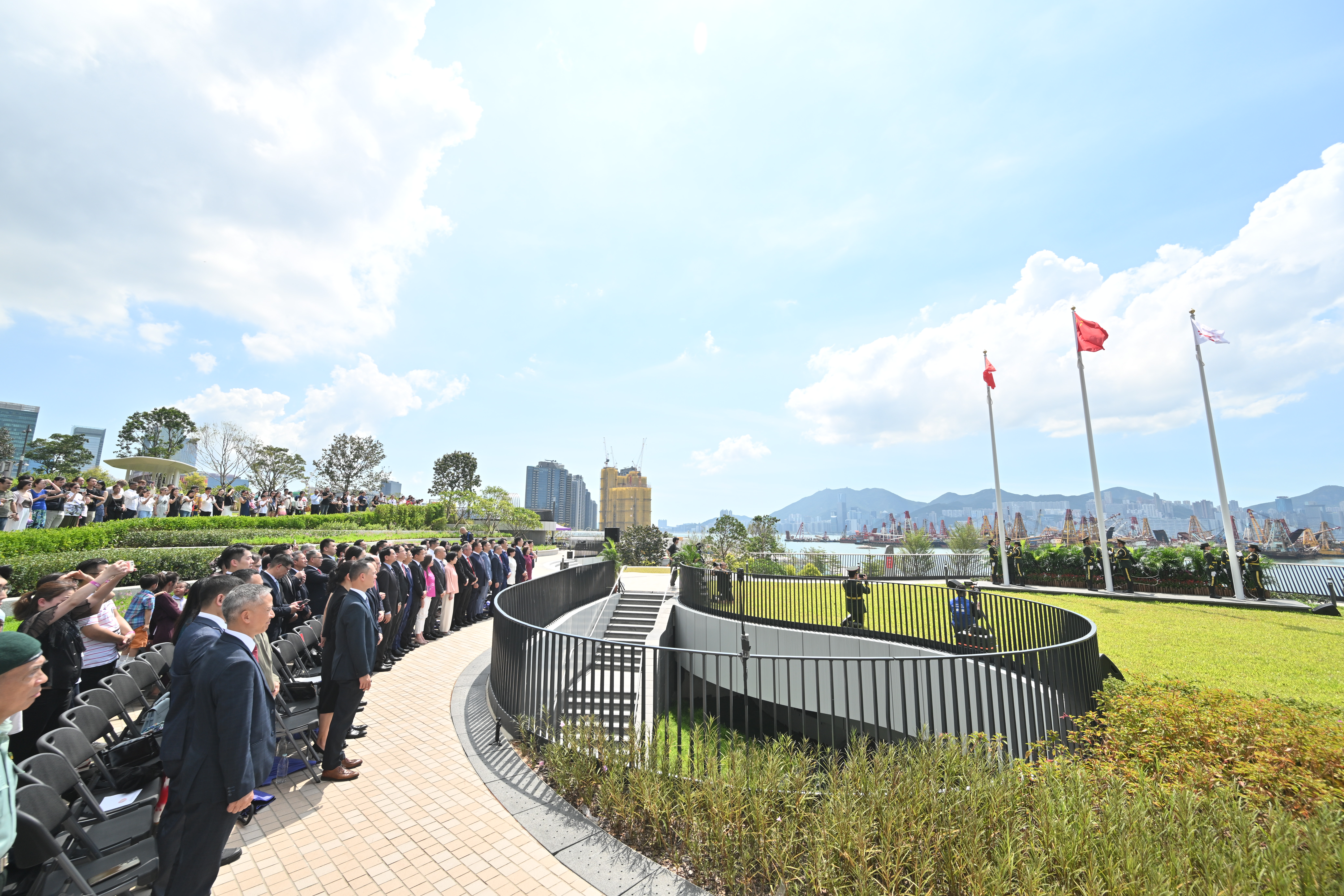 升旗儀式於啟德主場館南面花園舉行。出席嘉賓包括文化體育及旅遊局局長羅淑佩、常任秘書長沈鳳君及體育專員蔡健斌;中央人民政府駐香港特別行政區聯絡辦公室九龍工作部副部長郭長勇;立法會議員霍啟剛及鄧家彪;九龍城民政事務助理專員胡皓文;香港青少年軍總會會長李寧及主席陳振彬;保良局副行政總監劉志聰及教育總主任(學前教育及小學)文詩詠。陪同以上嘉賓出席的人員包括,周大福企業董事兼聯席行政總裁鄭志亮及何智恒;啟德體育園行政總裁莊澤基及副行政總裁湯錦偉。現場亦有大批市民一早到達美食海灣等候觀賞莊嚴的升旗儀式。