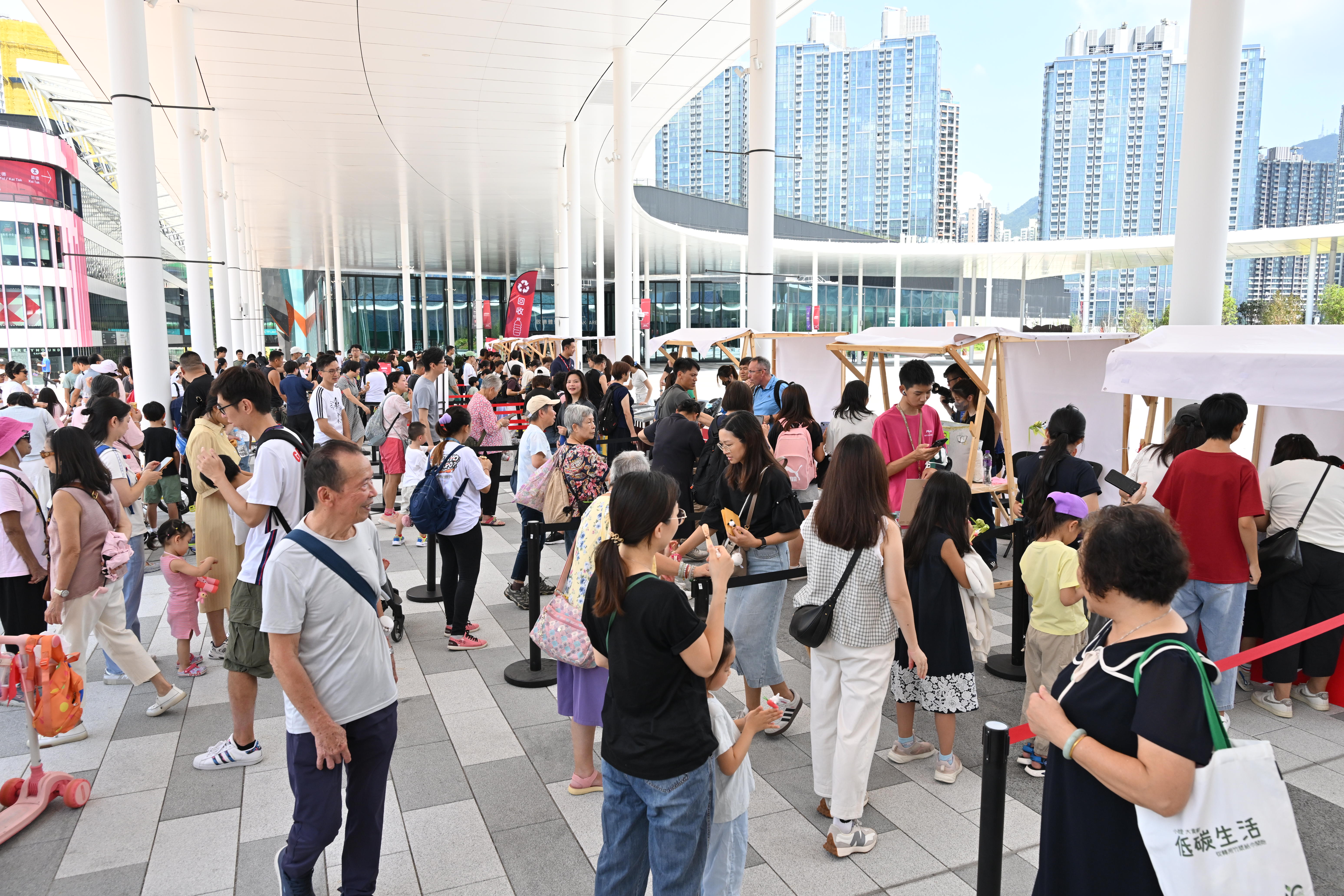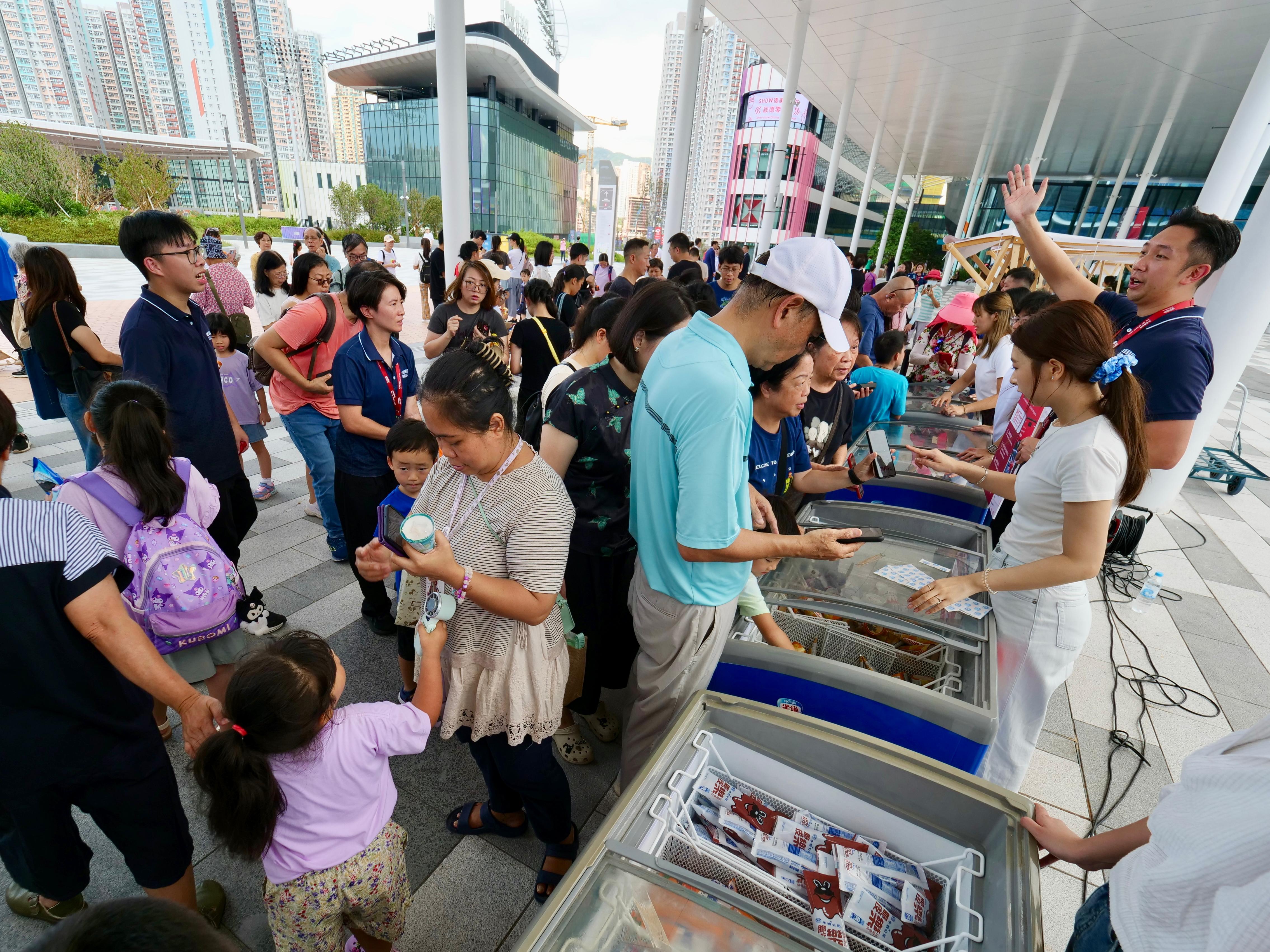 升旗儀式後,園方在中央廣場設置的具中華文化特色的互動攤位成為焦點,吸引大批市民及遊客踴躍參與。不少家長帶同小朋友到場,品嘗叮叮糖、糖蔥餅、龍鬚糖等本地懷舊小食,以及體驗糖畫、麵粉公仔及香包製作、草蜢編織、中國繩結、剪紙、書法等中華傳統文藝活動。當中免費雪糕派發攤位特別受小朋友歡迎,亦有不少市民駐足觀看國家安全教育展覽。體育園亦聯同環保機構設立環保同樂攤位,介紹體育園推行的環保措施,透過小遊戲推廣廢物分類及回收知識。