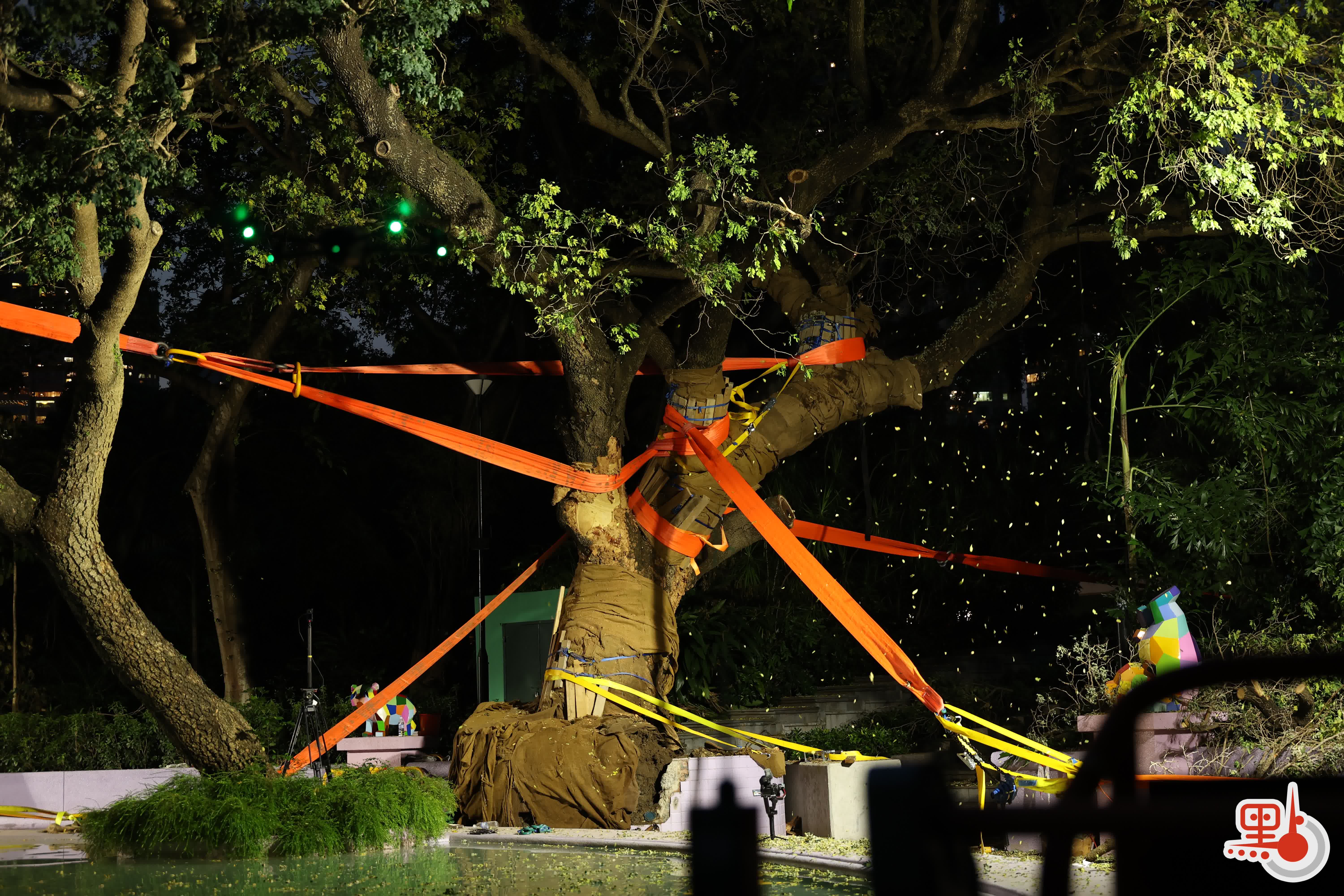 為此,義工隊採取了4項防護措施:用麻布袋覆蓋根繫鎖水補濕;邀請兩家園藝公司專家參與擬定方案;調配兩架大型吊機測算模擬斜拉方案;修剪樹冠並設置30米圍擋。同時,團隊捨棄金屬吊索,採用可承重30噸的帆布繃帶加「金剛圈」承托方案。