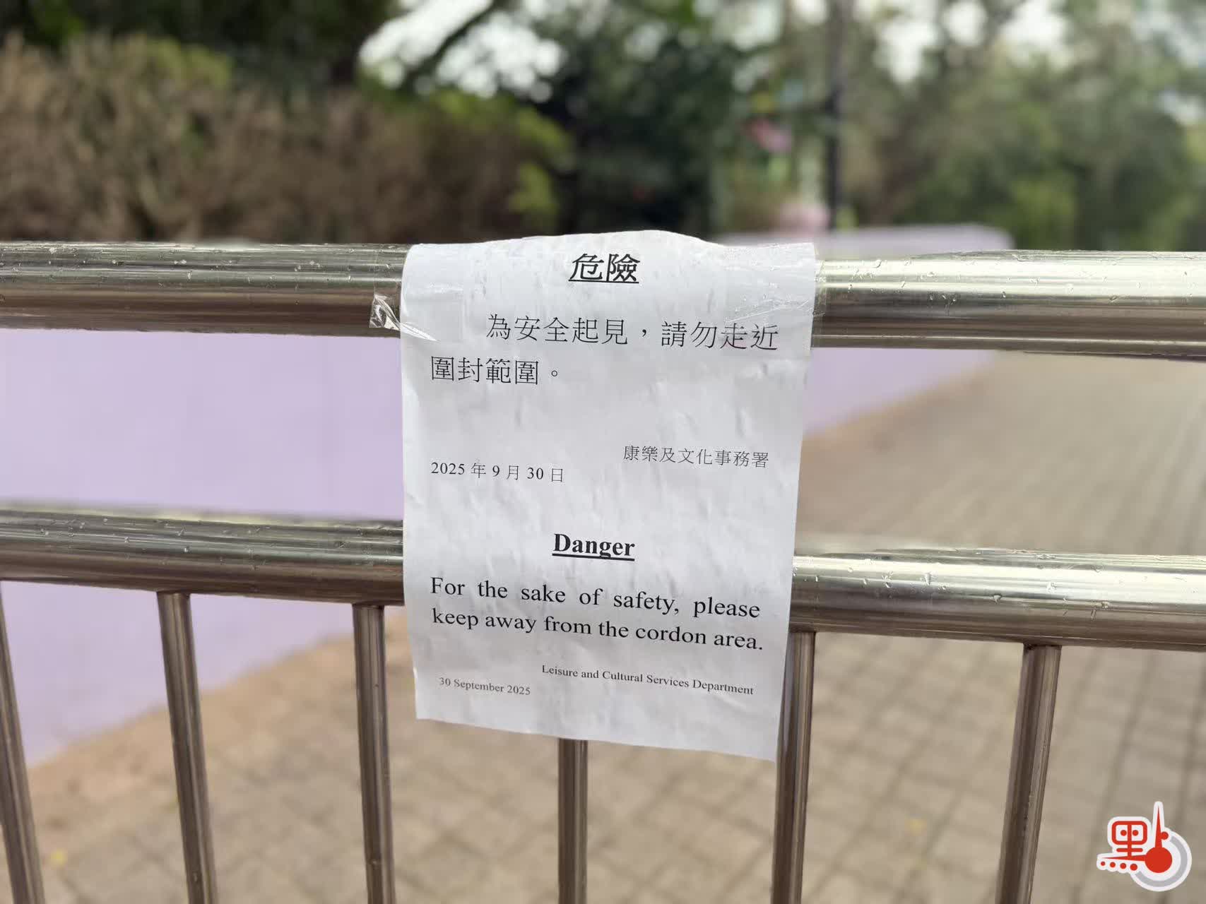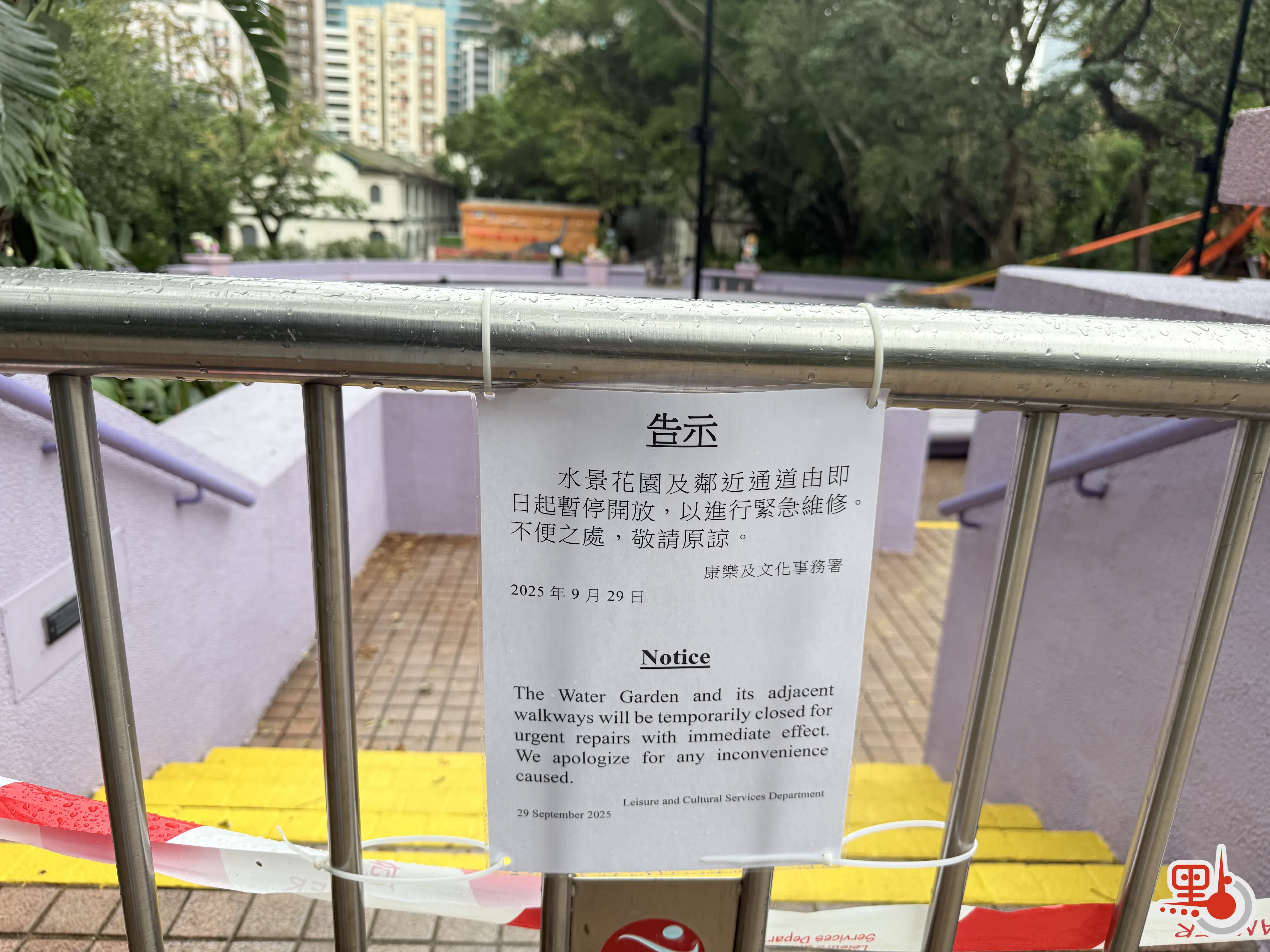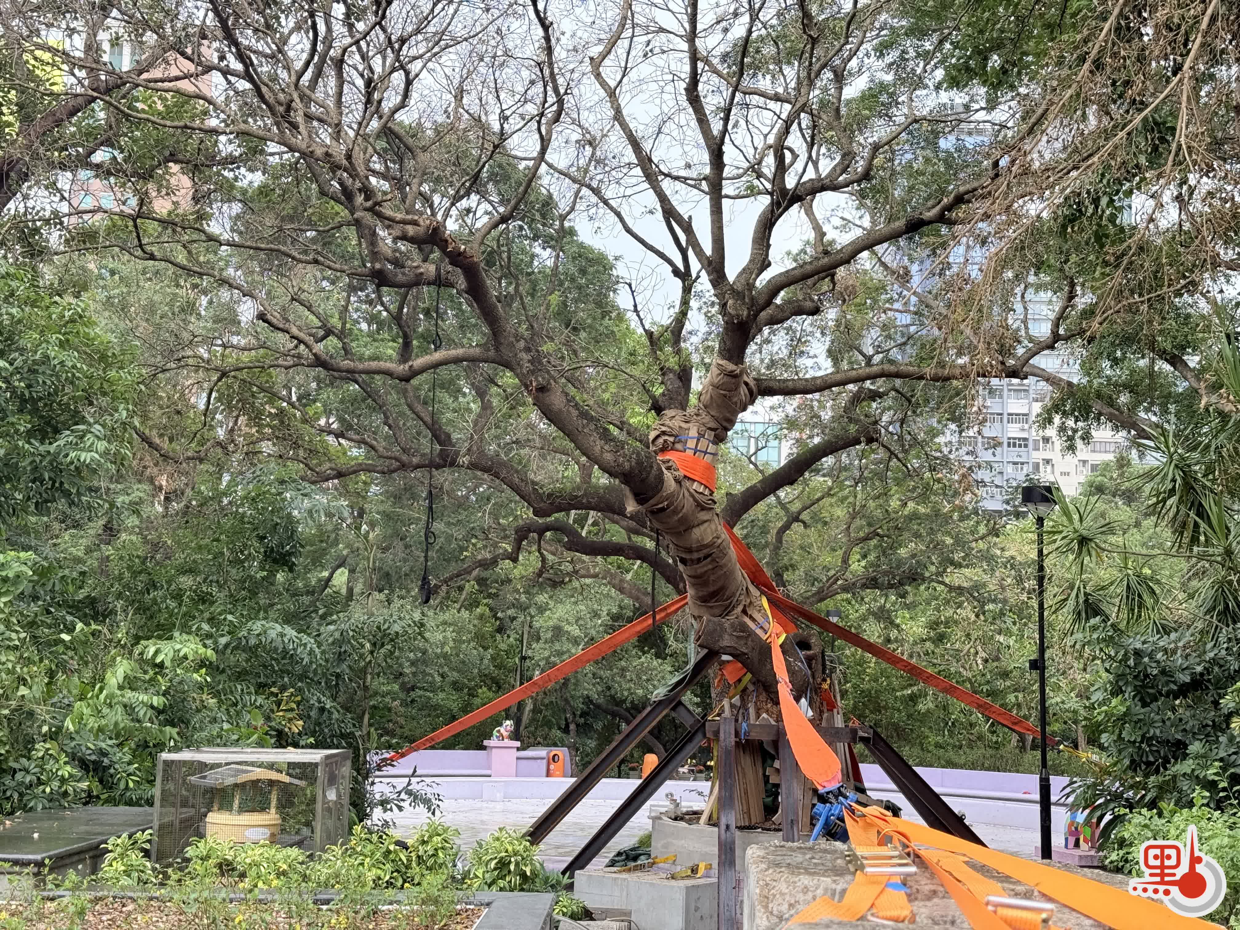 今日(10月4日)下午,颱風「麥德姆」下三號強風信號及雷暴警告生效,點新聞記者前往九龍公園,查看古樹在風雨天氣下的情況。現場所見,雖然室外風力強勁且細雨不斷,但古樹挺立並無大幅擺動,亦無彎曲或再次倒塌的跡象,健康狀況良好。目前古樹主要枝幹上仍有木板、帆布繃帶等加固材料保護,樹幹根部仍圍有麻布袋鎖水補濕,亦有支架作支撐,周圍堆疊不少防風沙袋增強穩定性。為保護市民安全,水景花園各處入口均已設立圍欄,貼有康文署告示「水景花園及鄰近通道由即日起暫停開放,以進行緊急維修」「為安全起見,請勿走近圍封範圍」。古樹周圍亦設安保人員看守,觀測樹木狀態並阻攔來訪者靠近。