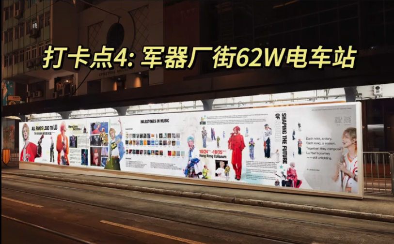 【點新聞報道】鹿晗「Season 4」亞洲巡迴演唱會香港站將於10月24、25日在紅館舉行,粉絲們提前一個月在全港啟動了大規模「痛城」應援。從叮叮車到地鐵站,從商場大屏到街頭藝術牆,整個香港變成了一張巨大的打卡地圖。無論你是要去現場還是純打卡,這份攻略都能幫你玩轉「鹿晗痛城」!