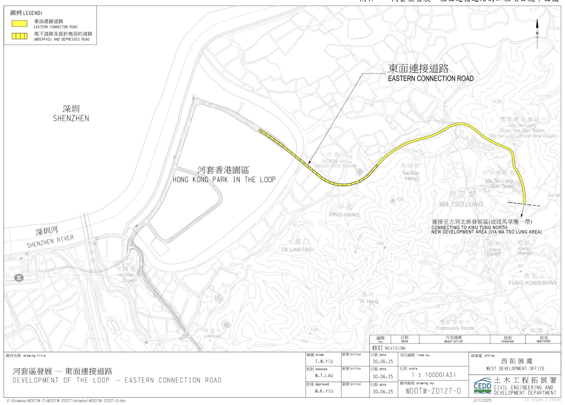 根據土木工程拓展署今年7月向元朗區議會簡介「河套區發展─東面連接道路」文件提到,為進一步加強河套香港園區對外的交通聯繫,土木工程拓展署現正規劃及設計一條東面連接道路,連接香港園區與古洞北新發展區的新建道路網絡,目標於2031年或之前完成有關道路工程。土拓署已於2023年12月就項目展開勘查研究,並就有關工程項目進行設計和相關技術影響評估、法定程序預備工作、以及公眾諮詢等。