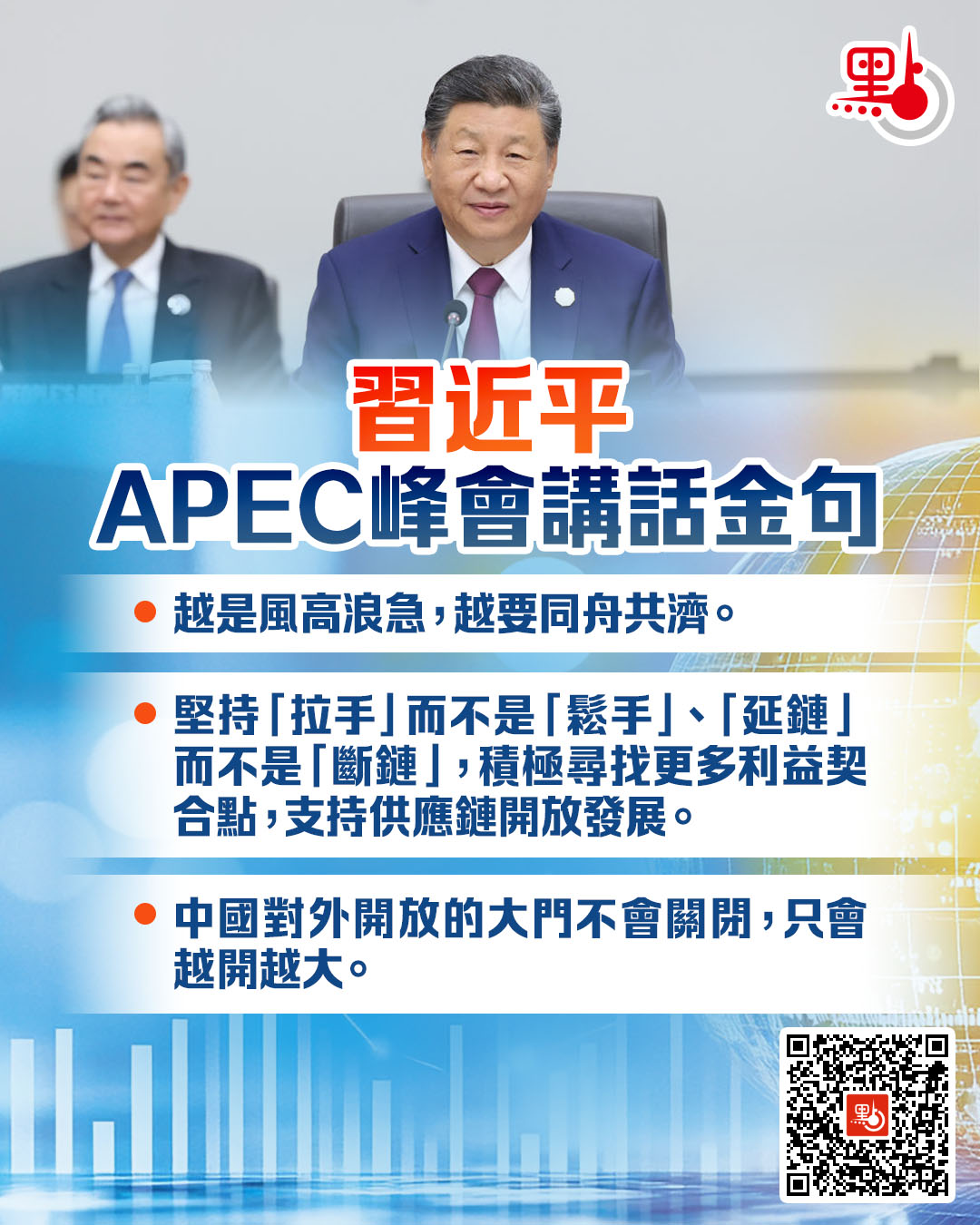 當前,世界百年變局加速演進,國際形勢變亂交織,亞太地區發展面臨的不穩定不確定因素增多。越是風高浪急,越要同舟共濟。我們要堅守亞太經合組織促進經濟增長、增進人民福祉的初衷,堅持在開放發展中分享機遇、實現共贏,推進普惠包容的經濟全球化,構建亞太共同體。為此,我提5點建議。