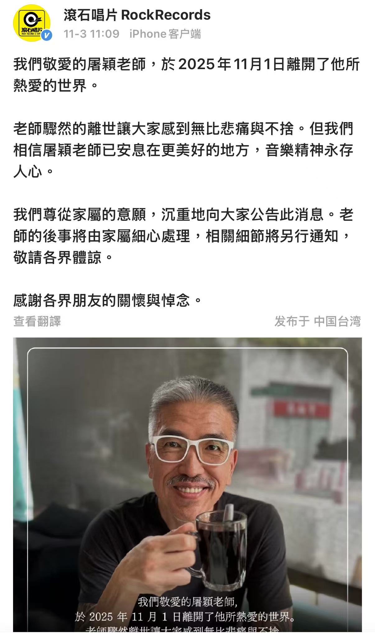 【點新聞報道】滾石唱片今日(11月3日)發布訃告,悼念台灣著名音樂人屠穎逝世,全文如下: