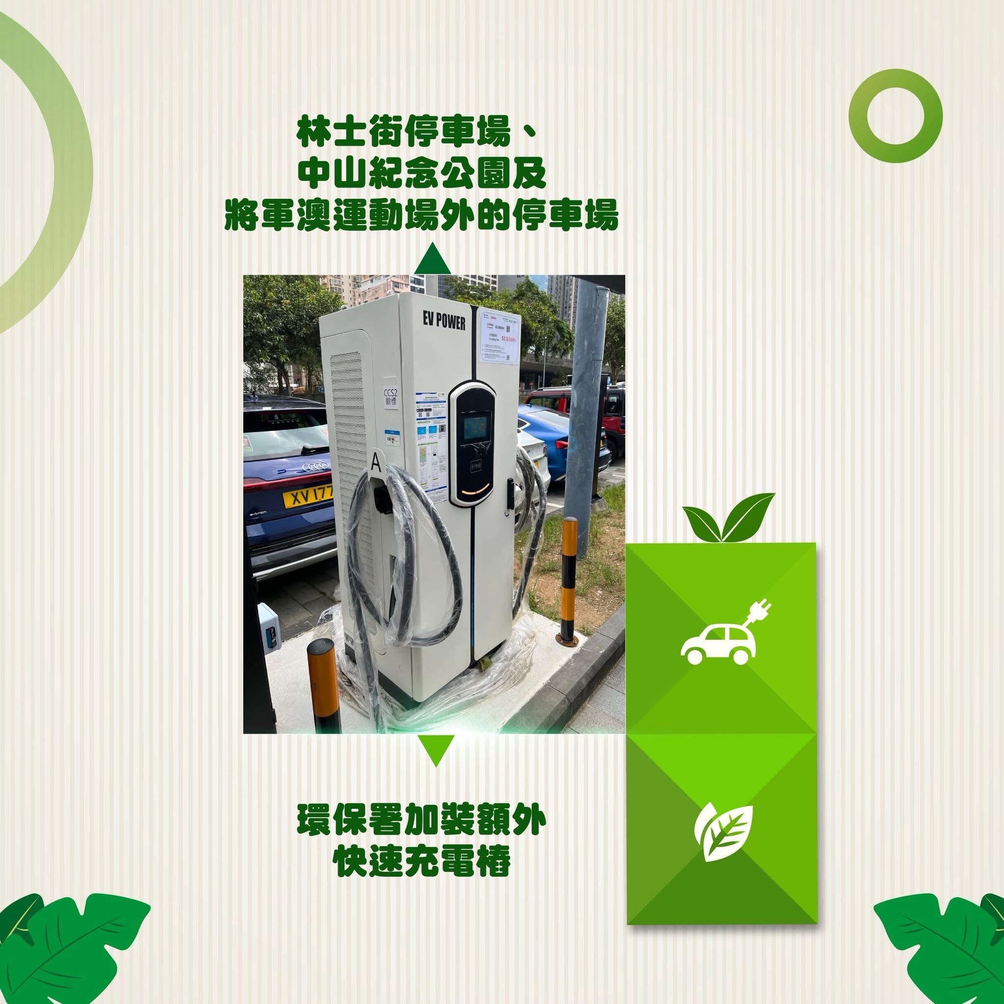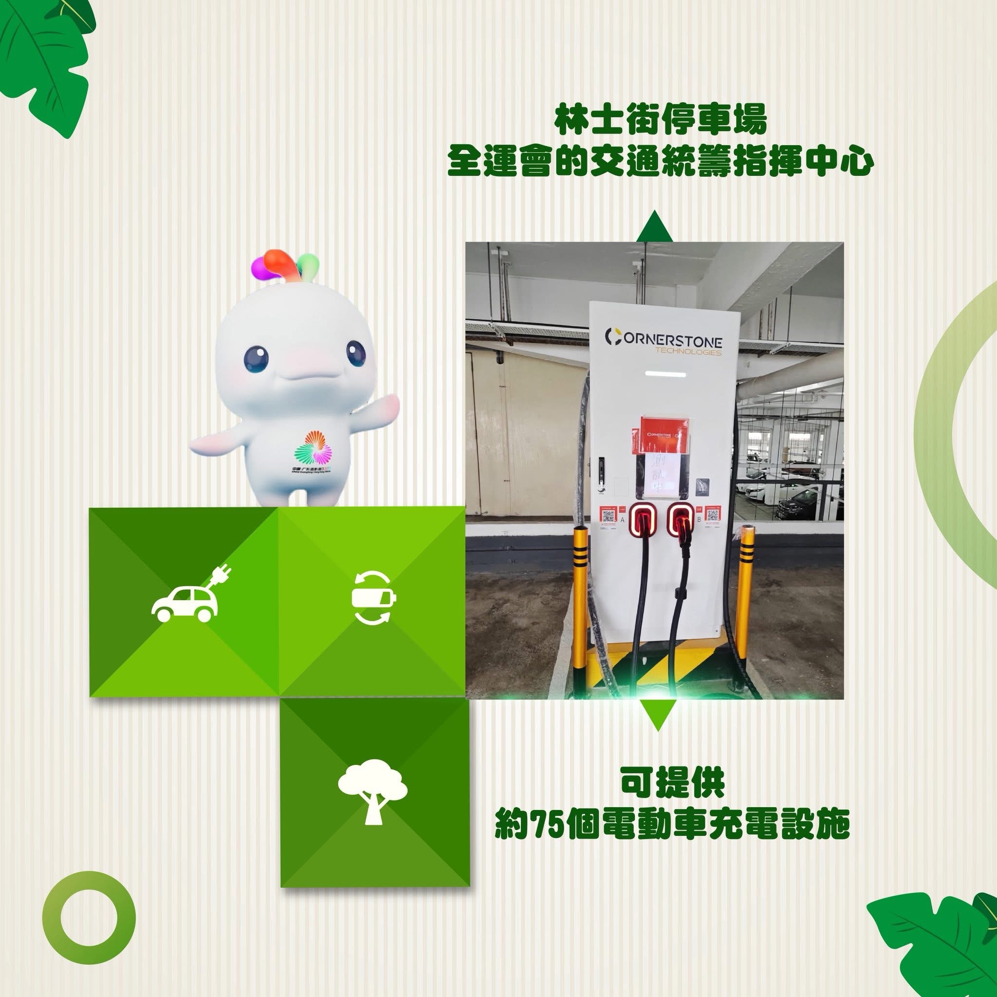 另外,上環林士街停車場作為全運會的交通統籌指揮中心,已具備約75個電動車充電設施。為進一步方便全運會車輛充電,環保署在林士街停車場、中山紀念公園及將軍澳運動場外的停車場安裝額外的快速充電樁,為香港賽區建設更環保的出行環境。