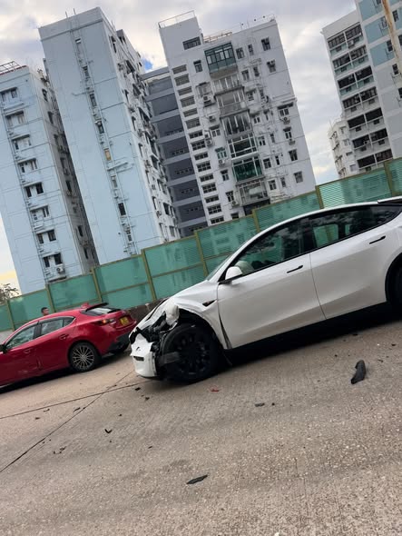 網上圖片可見,涉事白色私家車車頭凹陷損毀,零件脫落。往觀塘方向現車龍,交通嚴重擠塞。