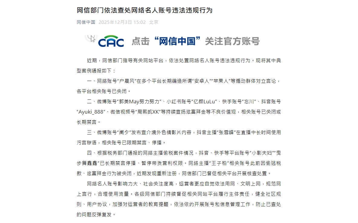 【點新聞報道】據「網信中國」微信公眾號今日(3日)消息,近期,網信部門指導有關網站平台,依法處置網絡名人賬號違法違規行為。現將其中典型案例通報如下: