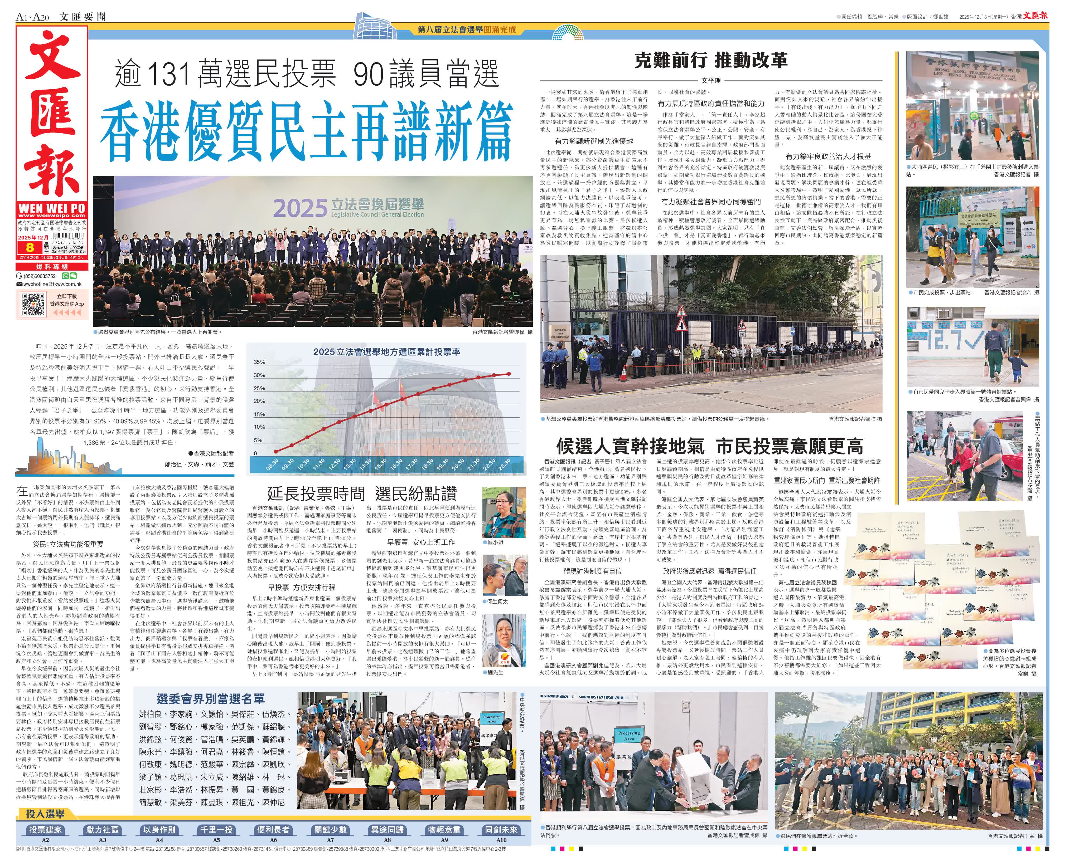 昨日、2025年12月7日,注定是不平凡的一天,當第一縷晨曦灑落大地,較歷屆提早一小時開門的全港一般投票站,門外已排滿長長人龍,選民急不及待為香港的美好明天投下手上關鍵一票。有人吐出不少選民心聲說:「早投早享受!」經歷大火蹂躪的大埔選區,不少災民化悲痛為力量,鄭重行使公民權利;其他選區選民也懷着「愛我香港」的初心,以行動支持香港。全港多區街頭由白天至黑夜湧現各種的拉票活動,來自不同專業、背景的候選人經過「君子之爭」,截至昨晚11時半,地方選區、功能界別及選舉委員會界別的投票率分別為31.90%、40.09%及99.45%,均勝上屆。選委界別當選名單最先出爐,姚柏良以1,397張得票膺「票王」;陳凱欣為「票后」,獲1,386票。24位現任議員成功連任。