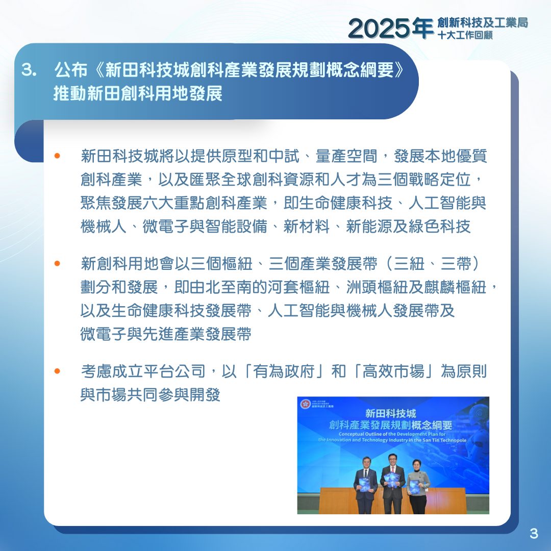 【點新聞報道】2025年踏入尾聲,創新科技及工業局今日(28日)於社交平台發文,回顧過去一年工作成果,當中包括河套香港園區今年正式開園並進入營運階段,以及公布開園《新田科技城創科產業發展規劃概念綱要》,聚焦發展六大重點創科產業等。一系列圖集帶你了解今年創科局所做的十大主要工作!
