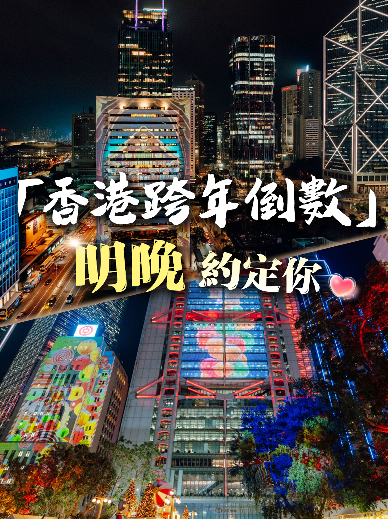 參與「光影匯·中環」的8幢建築物外牆,在2025年的最後20秒,以巨型倒數時鐘及光影圖案,上演長約3分鐘的光影表演,主題為「新希望、新開始」,向現場及全球觀眾送上祝福,一同邁進2026年。另外,灣仔會展中心玻璃外牆也會設有巨型倒數時鐘,讓附近的市民遊客一同感受跨年氣氛。