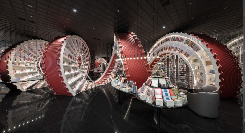 標誌性的螺旋式紅色矩形書架極具視覺衝擊力,出片率很高,彷彿置身於夢幻的書籍世界。店內還有咖啡廳,可在閱讀之餘享受一杯咖啡,度過愜意的時光。