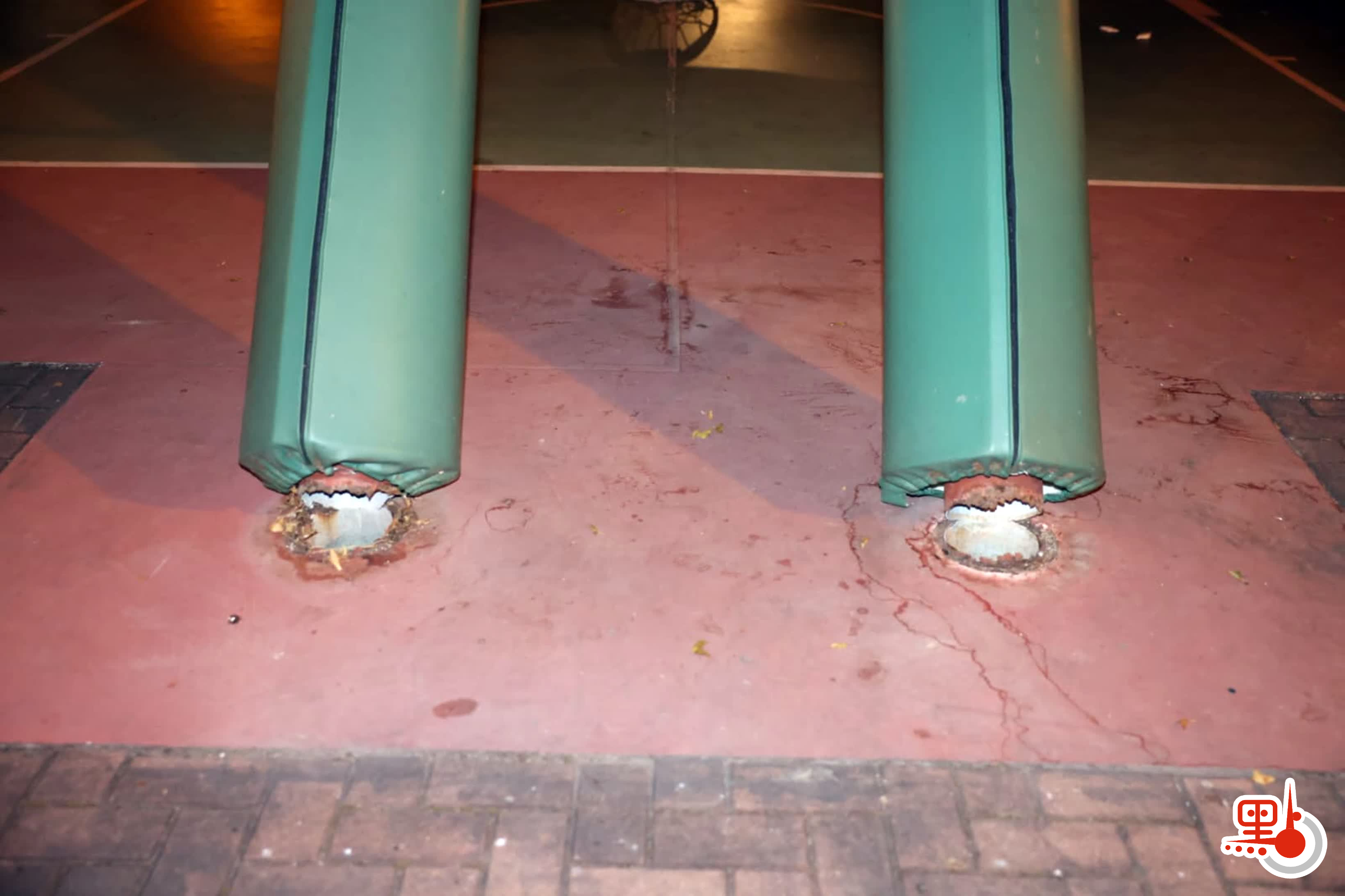 現場所見,倒塌的籃球架兩條豎立支柱與地面相接處嚴重鏽蝕斷裂,警方除圍封肇事籃球架現場外,為安全起見,亦將另一個同款籃球架圍封,暫停使用。警員亦已通知康文署跟進及檢查相關設施安全。