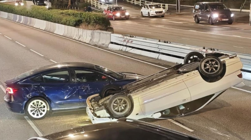 龍翔道兩車互撼一車四輪朝天 司機自行脫困