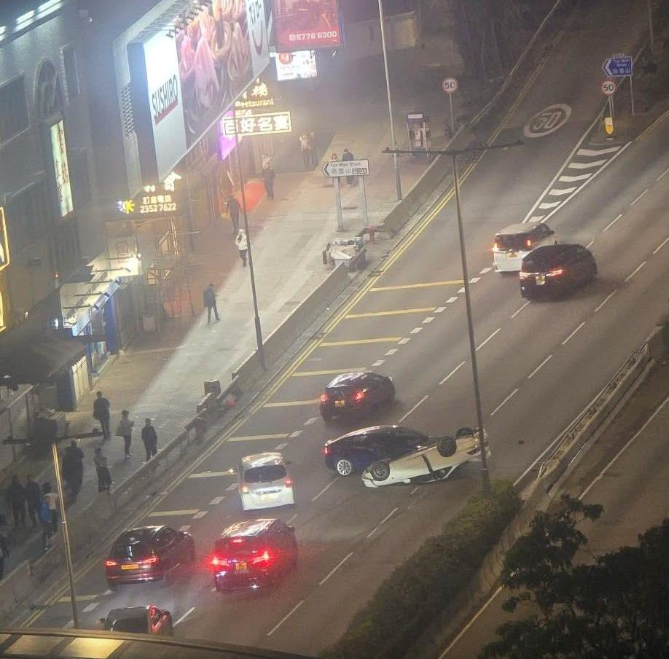 【點新聞報道】黃大仙龍翔道往觀塘方向近新光中心對出,今日(1月5日)晚上10時許兩部私家車意外相撞,其中一車反車四輪朝天。警方消防接報趕至時,兩車司機已自行脫困。