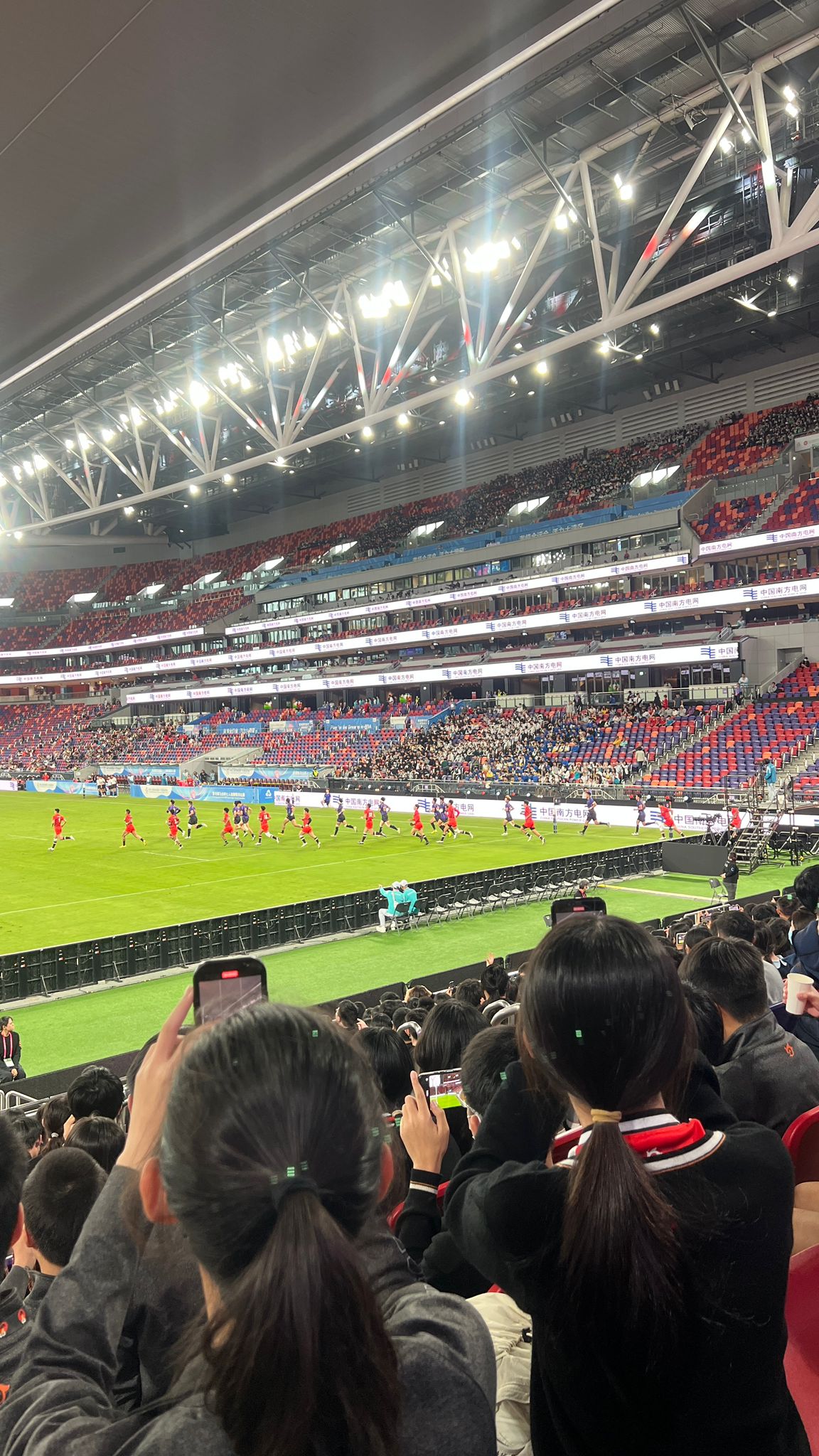 我的座位正正對着球員通道,令我能看見一個個球員自信地衝出來。令我驚訝的一位球員是來自港隊的十號。他身形細小,與那雙粗壯的腳形成莫大的對比。他那兇狠的眼神,挺直的身板,散發出令人畏懼的氣勢。