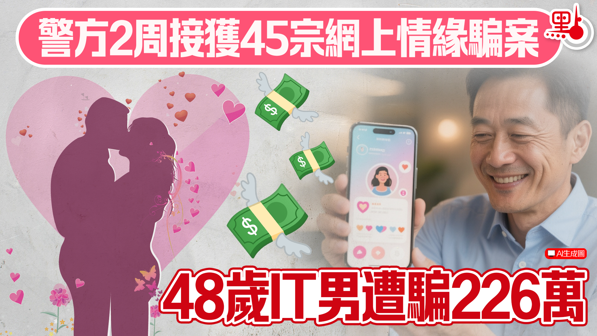 【點新聞報道】網上交友要避免落入騙徒的「情感陷阱」。警方昨日(4日)於社交專頁「守網者」發文稱,在過去的2周內,接獲了45宗網上情緣騙案,涉款4,300萬元。其中一名48歲從事電腦行業的男子,早前在社交平台Instagram收到騙徒訊息,交談約一個月後雙方發展網戀,最終被騙走共226萬元。