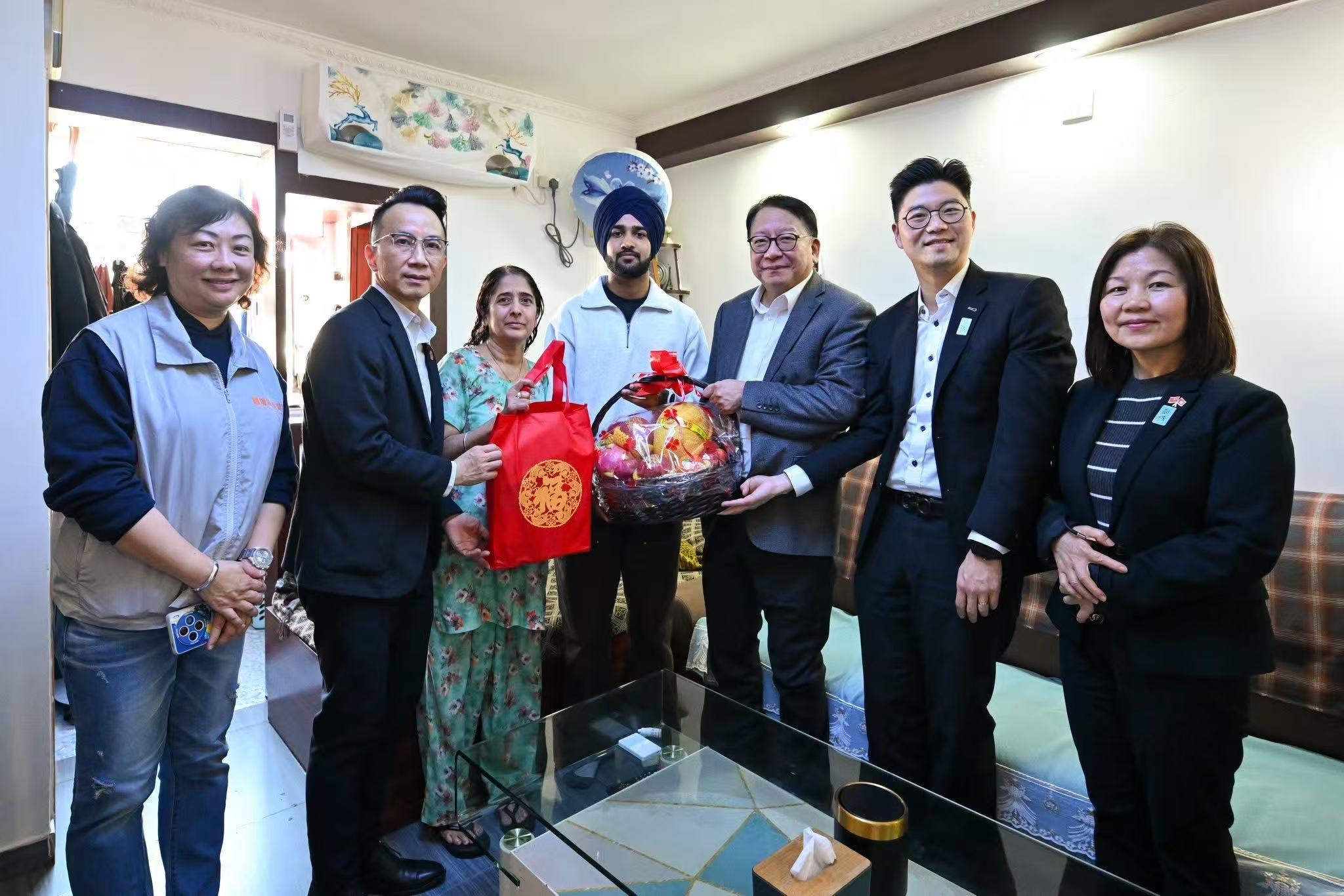 【點新聞報道】農曆新年是與摯愛親朋共聚一堂,傳遞祝福和關愛的季節。政務司司長陳國基今日(13日)下午聯同民政及青年事務局常任秘書長李百全、觀塘民政事務專員、多位觀塘區議員及關愛隊成員,到觀塘順利邨探訪兩戶家庭,送上來自特區政府的節日問候與祝福。