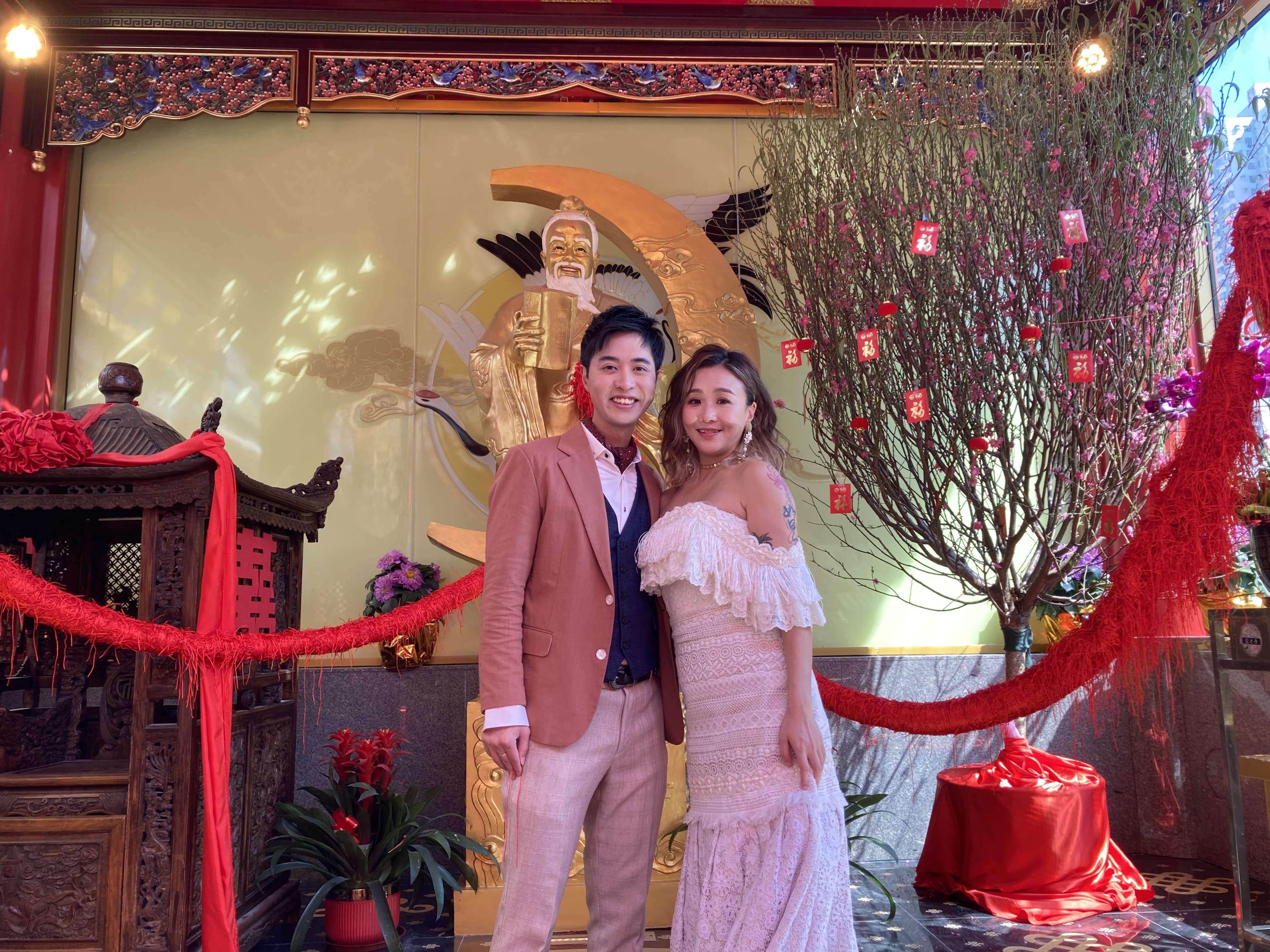 記者今日於現場見到陸續有市民到月老殿參拜,當中有脫單者前來還願,亦有單身人士特意來祈願,並在卡片寫下「早遇良人 喜結良緣」、「順順利利走向圓滿 甜蜜幸福」等心願,更有新人盛裝而來拍攝結婚照。