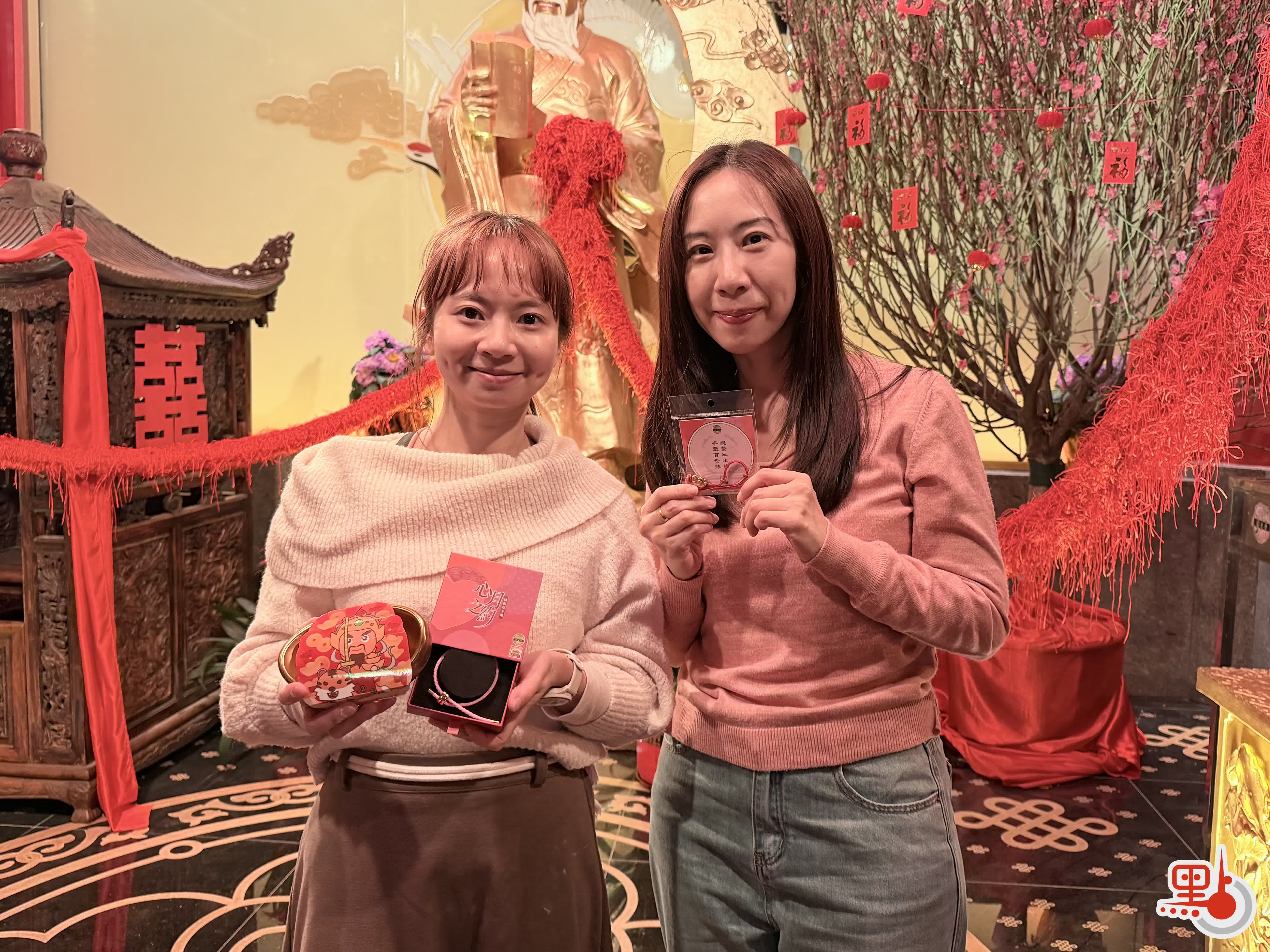 市民陳女士和伍女士特意從葵芳來拜月老,以祈求新的一年順利脫單,「香港較少寺廟有月老殿,因此特意在下班後來黃大仙祠,看到裝飾和文創品設計都不錯。」她們向記者展示所購買的手繩,並表示「希望有機會脫單後,回來感謝月老。」
