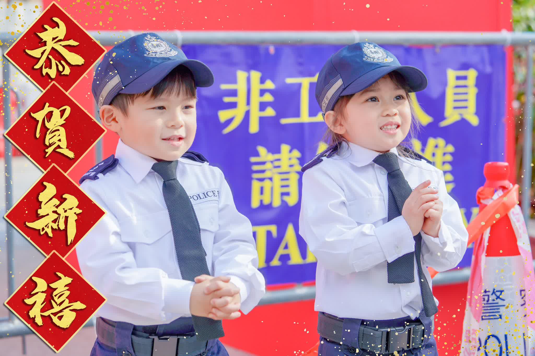 【點新聞報道】今日(18日)大年初二,警隊專頁發布帖文,小萌警Caitlyn聯同Frankie仔向市民拜年,祝大家馬到功成,身體健康!同時回顧兩位警隊「精嬰」,較早前代表北角分區活動管理組出更,到達維園年宵當值,兩位除搬雪糕筒、拉橙帶及放鐵馬外,還幫手「開咪(揚聲器)」疏導人流,不要小看兩位小萌警「人仔細細」,但中氣十足,犀利呀。
