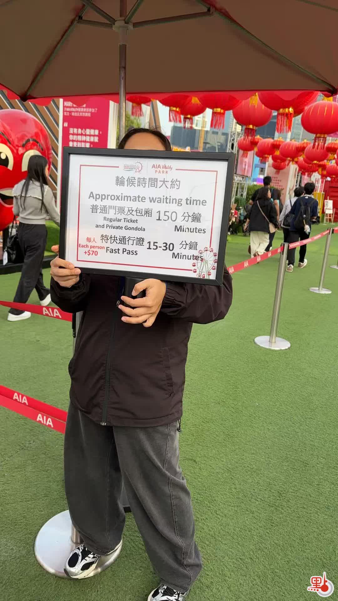 現場工作人員表示,持普通門票及包廂需輪候約150分鐘左右,而持特快通行證的乘客輪候時間則為15至30分鐘,特快通行證需每人加多70蚊。