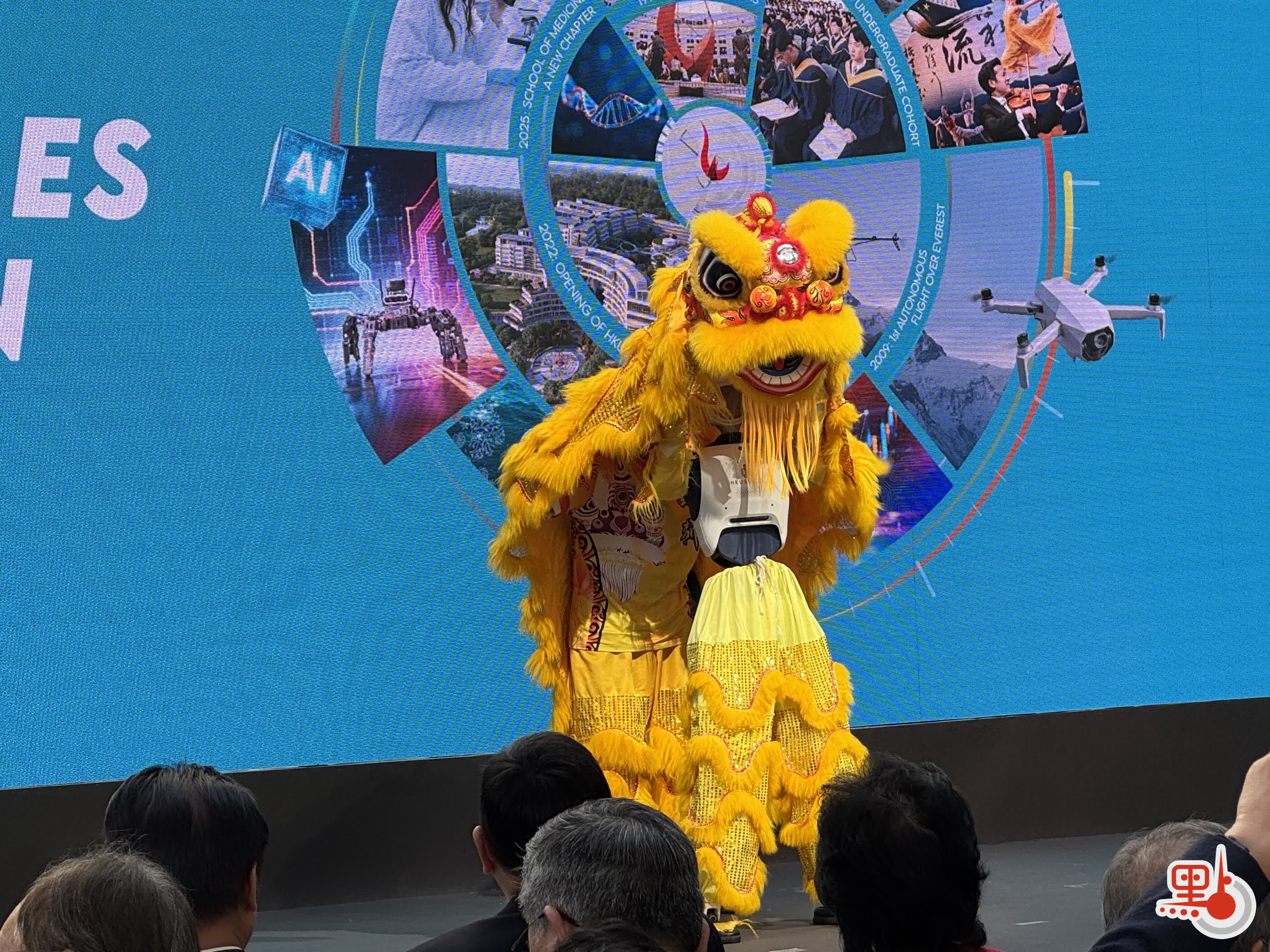 今日的啟動儀式上,科大(廣州)團隊呈獻了一場別出心裁的醒獅表演,由機械人戴上裝飾模擬人類舞動,巧妙糅合了傳統文化與前沿科技。
