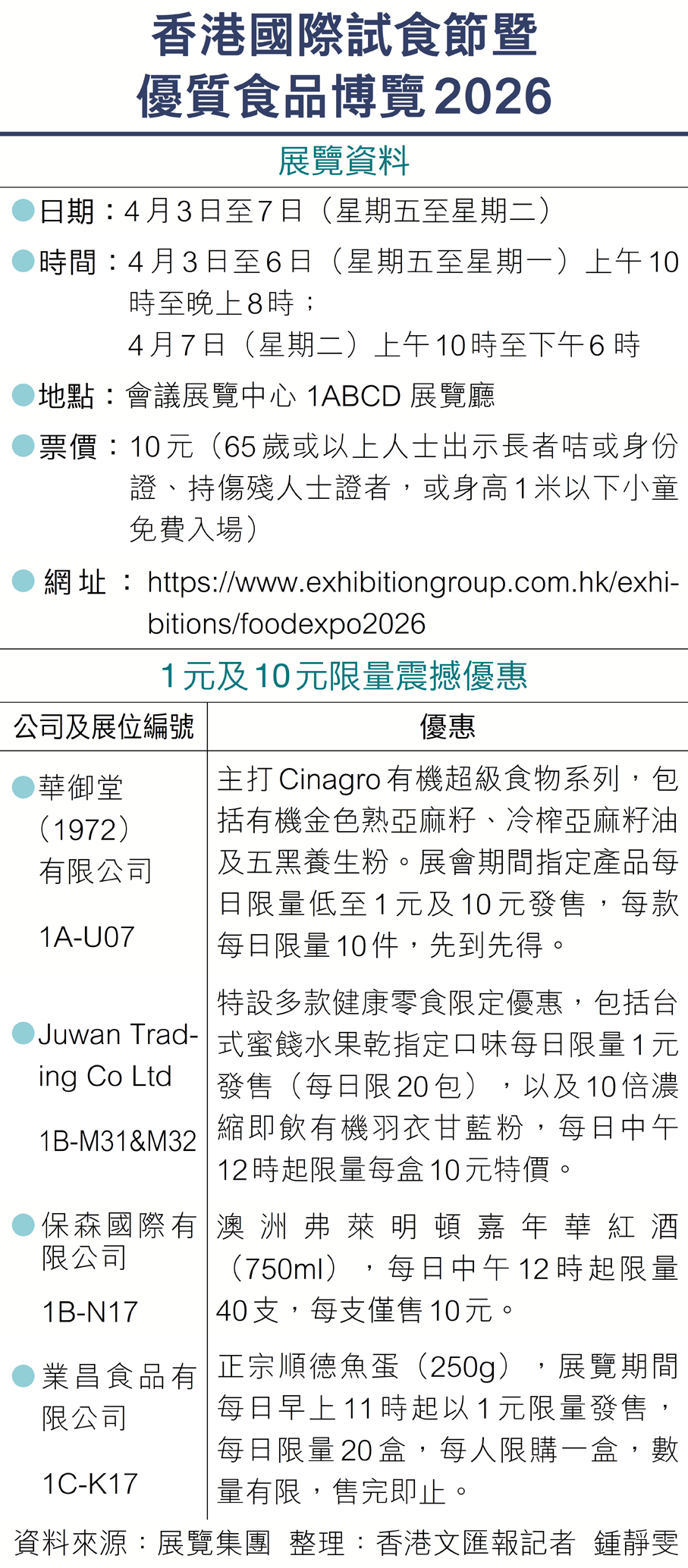 展覽集團主辦的「香港國際試食節暨優質食品博覽2026」將於4月3日至7日假會展中心舉行,匯聚超過50個國家及地區近500個展位,以「預先試食、安心選購」為特色,帶來海鮮、零食、有機食品、茶飲及酒品等多元選擇,多款產品包括有機食材、台式水果乾、順德魚蛋等以低至1元限量發售,另展期首日頭1,000名入場人士更可免費獲取燒肉一份。