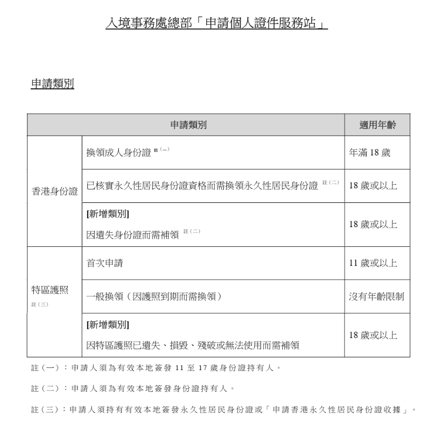 現時,持有有效本地簽發永久性居民身份證或「申請香港永久性居民身份證收據」的人士,可於服務站辦理以下類別的特區護照申請,無需預約: