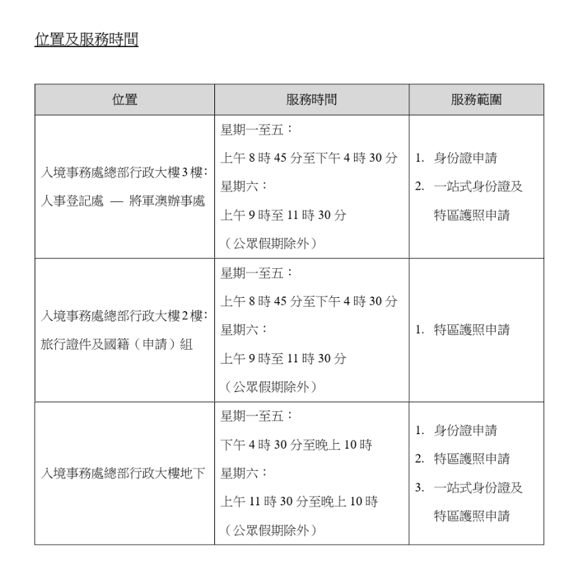 合資格申請人可選擇使用服務站一站式辦理身份證和特區護照的申請。服務站設於將軍澳入境處總部,有關服務站涵蓋的申請類別、位置及服務時間,請參閱附件。市民亦可瀏覽入境處網頁或使用其流動應用程式查閱以上資料。