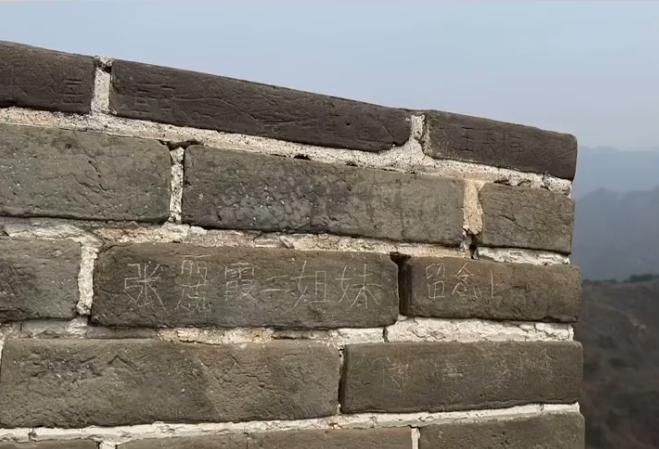 現場視頻可見,一名女遊客在長城上刻下「二姐妹留念」等文字,另一同行女遊客則在旁拍照記錄。