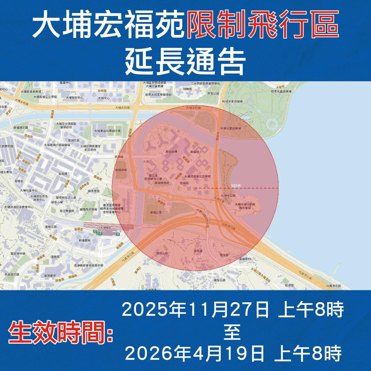 【點新聞報道】警方今日(4月2日)表示,鑒於公眾安全,警務處在大埔宏福苑範圍已設立「限制飛行區」。時間將由2026年4月5日上午8時延長至2026年4月19日上午8時。