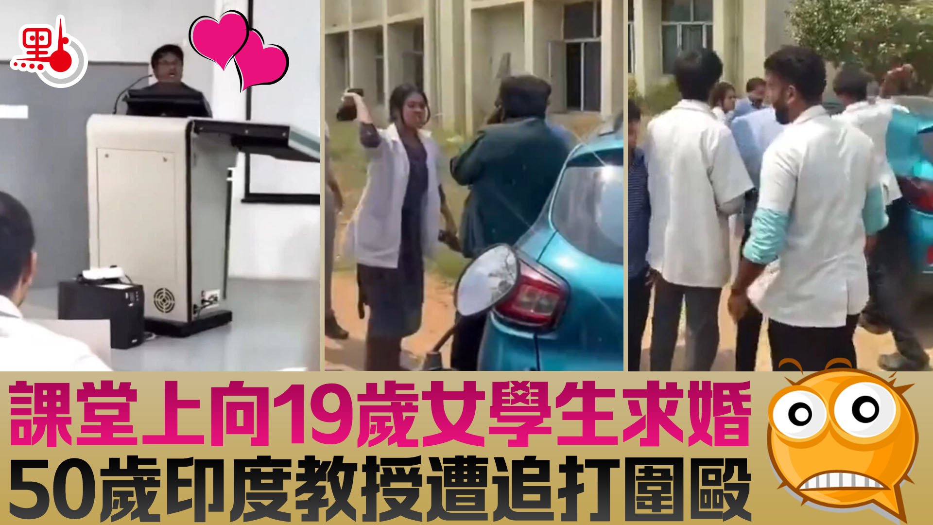 【點新聞報道】印度卡納塔克邦(Karnataka)一名50歲醫學院助理教授竟在課堂上公開向19歲的女學生告白求婚,此舉隨即引爆全校學生怒火,他在校園內遭到該女學生及其他同學追打,其狼狽畫面在網上瘋傳。事後醫學院已將該名助理教授停職,同時交由警方處理。