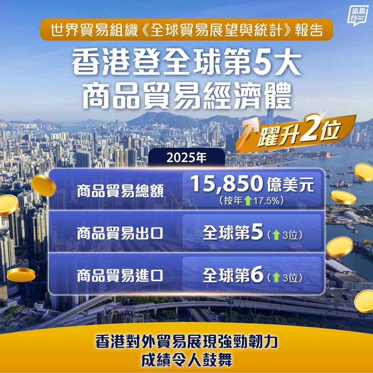 【點新聞報道】世界貿易組織最新發表《全球貿易展望與統計》報告,在2025年,香港緊隨中國內地、美國、德國與荷蘭,位列全球第五大商品貿易經濟體。財政司副司長黃偉綸今日(4月3日)在社交平台發文指,本港2025年商品貿易總額達15850億美元,按年上升17.5%,佔全球總額3%,形容「成績令人振奮」。