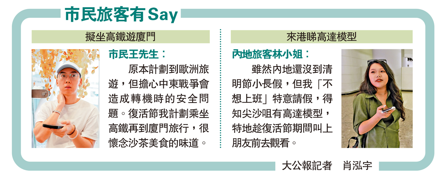 旅遊業促進會總幹事崔定邦表示,因燃油附加費上漲及中東戰爭影響,歐美等遠程航線航班緊張、票價高企,而內地旅遊資源豐富、性價比高,不少原本計劃出國的旅客轉而選擇內地高鐵遊,高鐵團數量較去年增長三成。他預計今日是內地旅客來香港旅遊的高峰,多班由內地南下香港的高鐵車票已告爆滿,預計呈現「北上南下」的「雙向奔赴」局面。