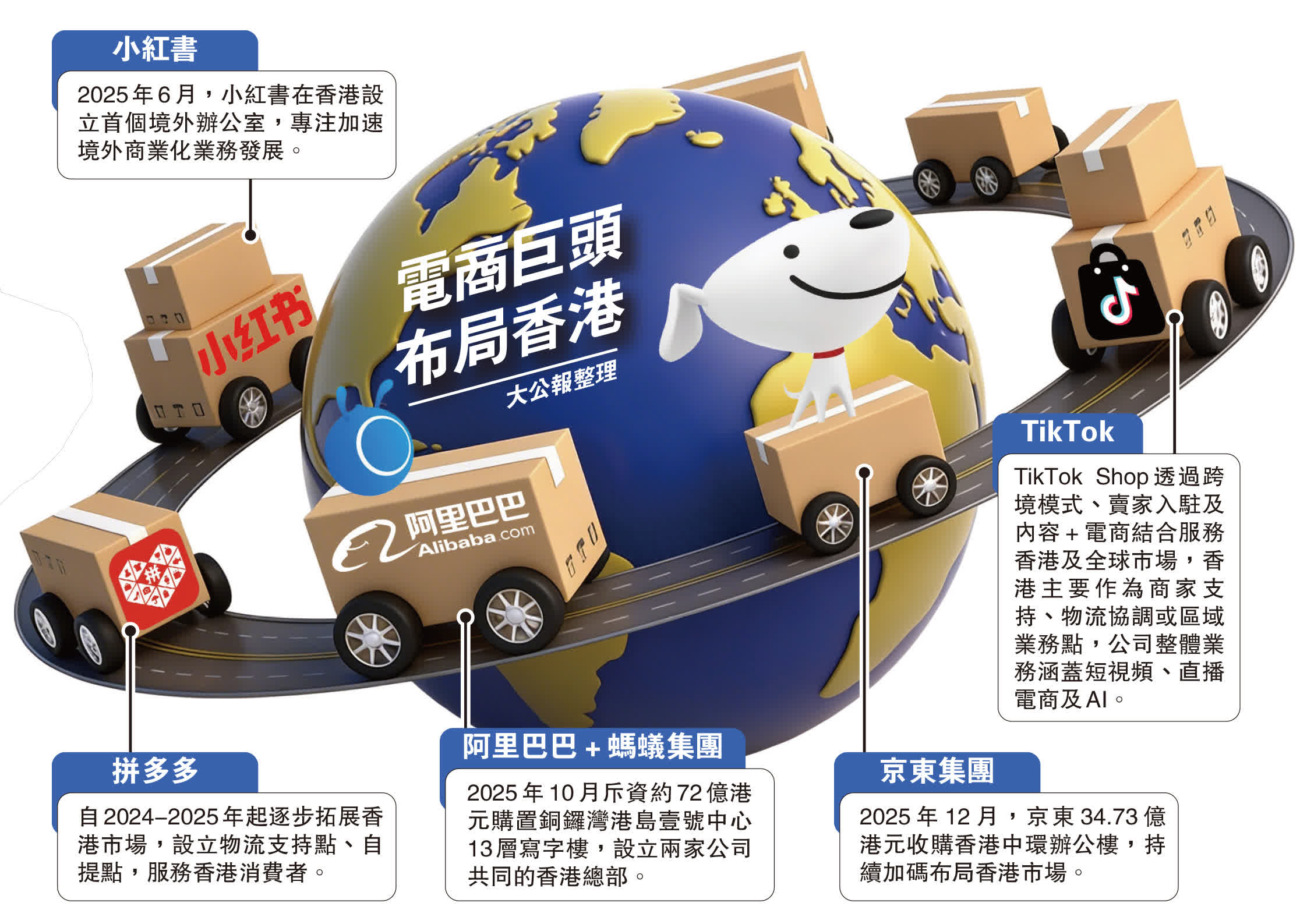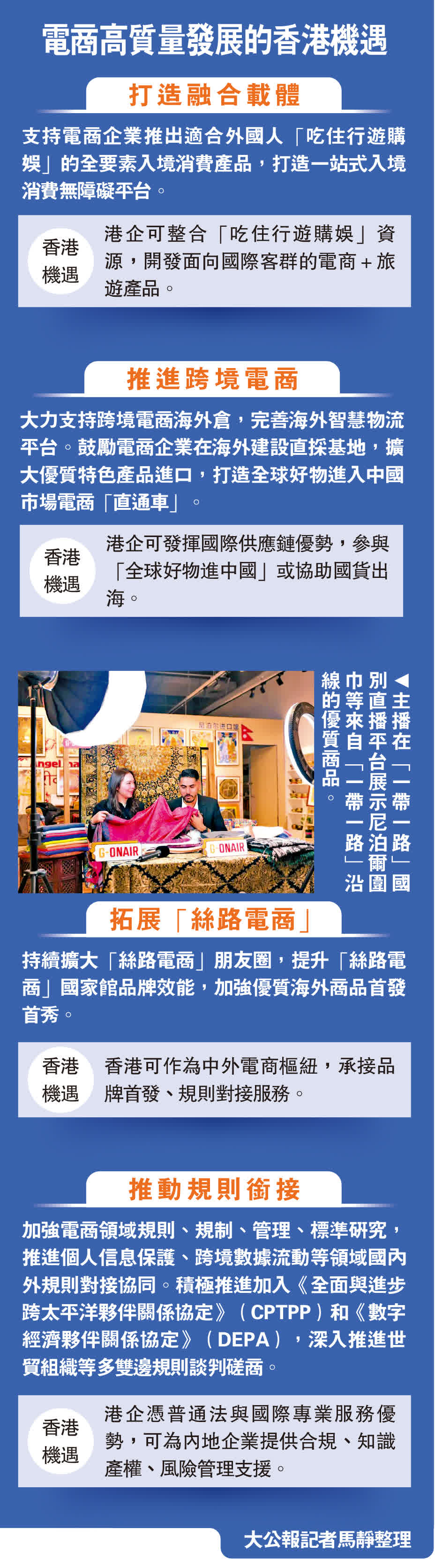 《意見》指出,加強優質海外商品首發首秀,培育一批「絲路電商」重點合作城市,並鼓勵電商企業在海外建設直採基地,打造全球好物進入中國市場電商「直通車」。當前,內地電商巨頭紛紛加碼投資香港,專家向大公報記者表示,香港可用好國際化設計力量和營銷經驗,助力共建「一帶一路」國家轉型為高附加值品牌運營者,更好融入和服務國家發展大局,實現自身更好發展。