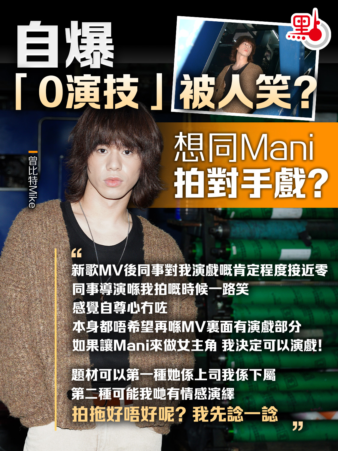 問及早前放話想邀請Mani出演MV女主角,曾比特直言「真心嘅」,因為工作人員曾提到Mani拍攝過MV,他對此感到新奇,希望有機會讓歷史重現。題材方面,他認為可以是上司和下屬之間的爭論,亦可考慮在情感上有所演繹,「拍拖好不好呢?我先諗一諗,可能有啲對手戲。」不過,他笑指工作人員對他在新歌MV的演技「肯定程度接近零」,「本身不希望MV再有演戲部分,但如果讓Mani來做女主角,我決定可以演戲!」