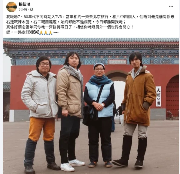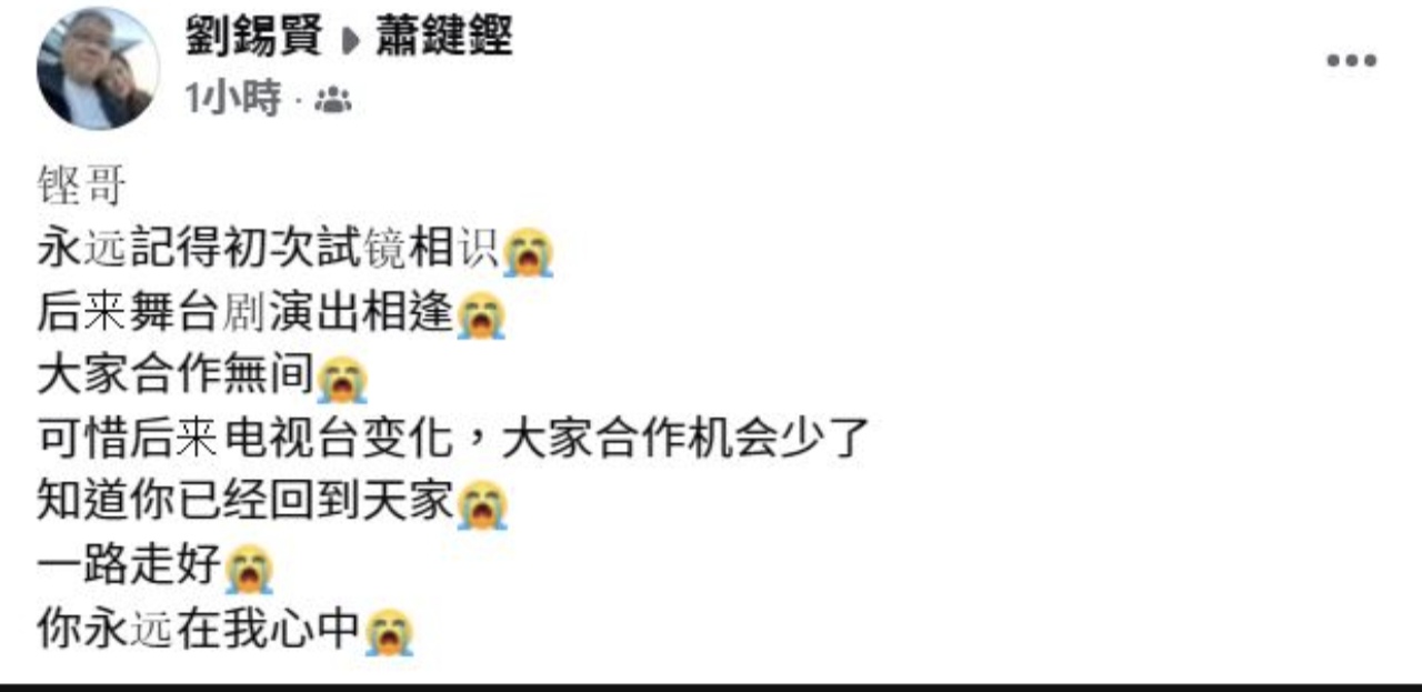 可惜蕭鍵鏗最後不敵病魔撒手塵寰,楊紹鴻在FB貼出昔日工作合照感懷:「相片中四個人,估唔到最先離開係最右邊嘅陳木勝,右二嘅蕭鍵鏗……真係好懷念當年同你哋一齊拚搏嘅日子,相信你哋喺另外一個世界會開心!鏗,一路走好。」「亞視忠臣」劉錫賢亦留言:「鏗哥,永遠記得初次試鏡相識,後來舞台劇演出相逢……知道你已經回到天家,一路走好。」