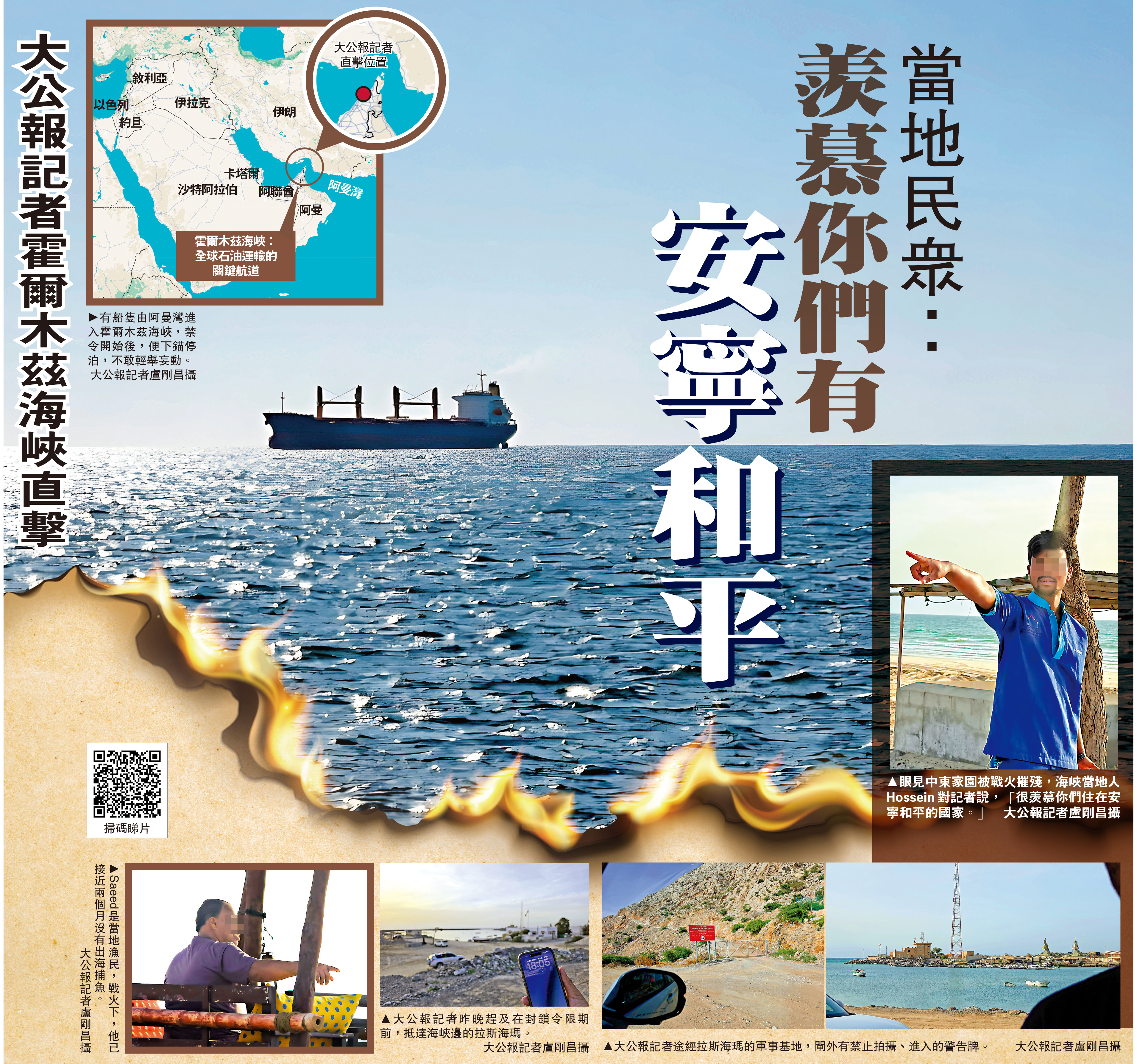 大公報記者抵達阿聯酋最北端的拉斯海瑪,昨晚在霍爾木茲海峽的岸邊,直擊美國海軍封鎖霍爾木茲海峽一刻,由禁令開始後的40分鐘,遠處海邊傳來第一輪震耳欲聾的炮聲。當地民眾表示,戰爭為平民帶來災難,批評美國將炮火帶到中東,羨慕中國內地和香港特區安定繁榮,期望中東早日恢復和平。