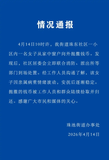 廣東汕頭龍湖區珠池街道辦事處發布情況通報指,4月14日10時許,我街道珠東社區一小區內一名女子從家中窗戶向外拋撒錢幣。發現後,社區居委會立即聯合消防、派出所等部門到場處置。經工作人員溝通了解,該女子因親屬病重情緒波動,安撫後逐漸穩定。拋撒的錢幣被工作人員和群眾陸續拾取並歸還。感謝廣大市民和媒體的關心。