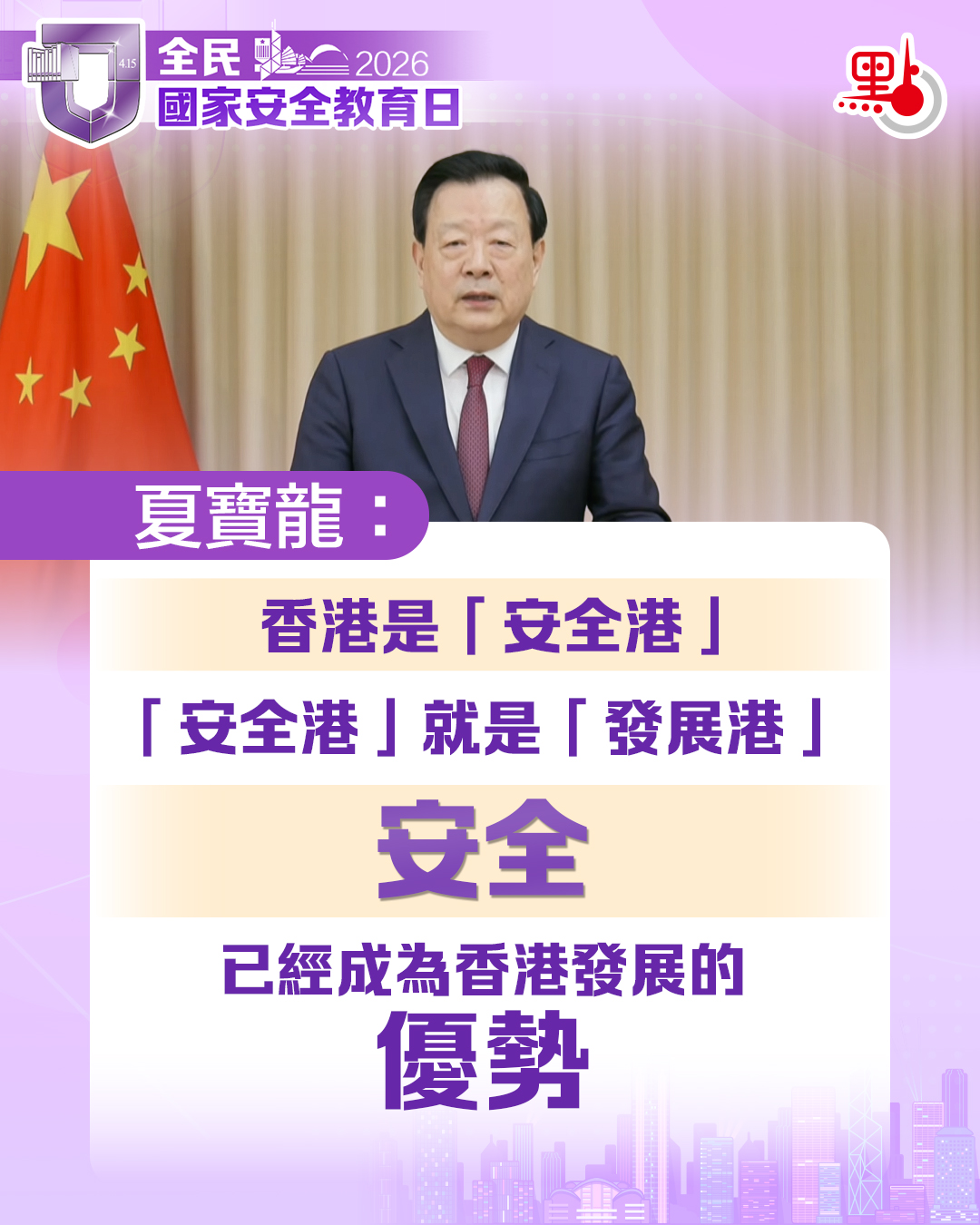 【點新聞報道】「全民國家安全教育日」開幕典禮暨主題講座今日(15日)上午在香港會議展覽中心舉行。中央港澳工作辦公室主任、國務院港澳事務辦公室主任夏寶龍以視頻方式出席開幕典禮並發表致辭。夏寶龍強調,香港是「安全港」,「安全港」就是「發展港」。安全已成為香港發展的優勢。夏寶龍的致辭都有哪些要點?快來多圖睇清!