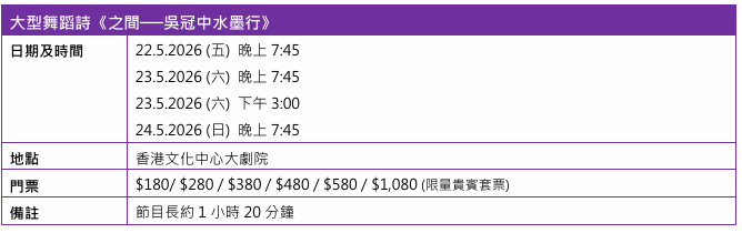 【點新聞報道】香港舞蹈團與康樂及文化事務署首次聯合主辦的大型舞蹈詩《之間──吳冠中水墨行》將於2026年5月22日至24日,假香港文化中心大劇院公演4場。該節目為中華文化節2026節目之一。