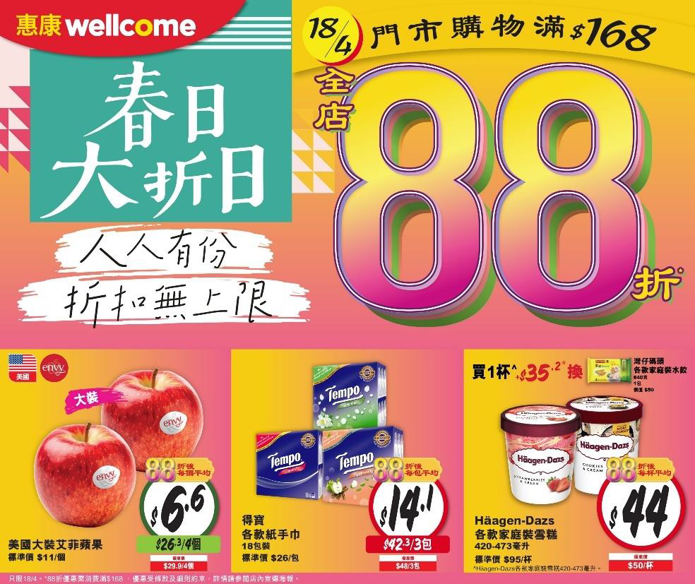 惠康:4月18日門市滿$168即享88折