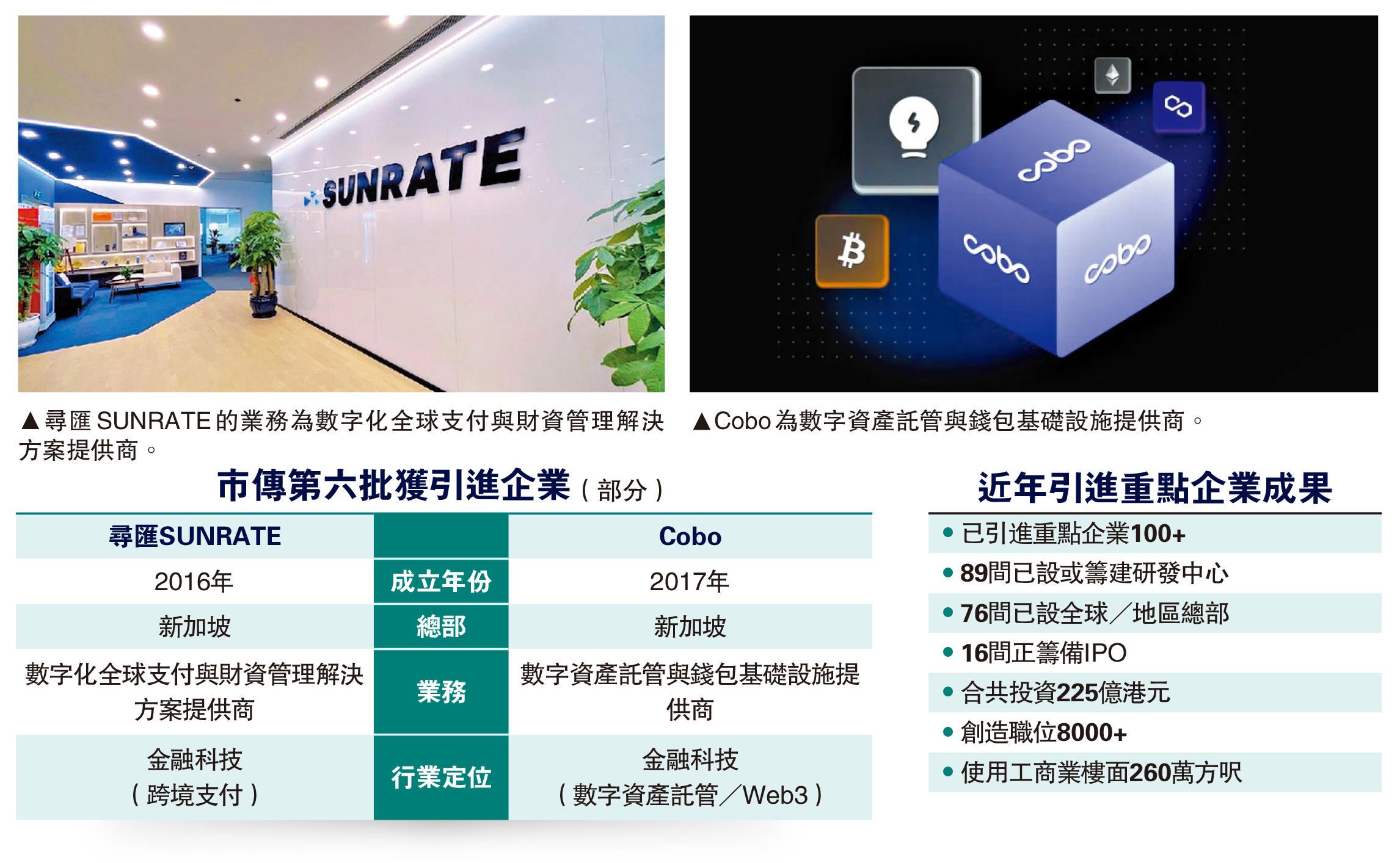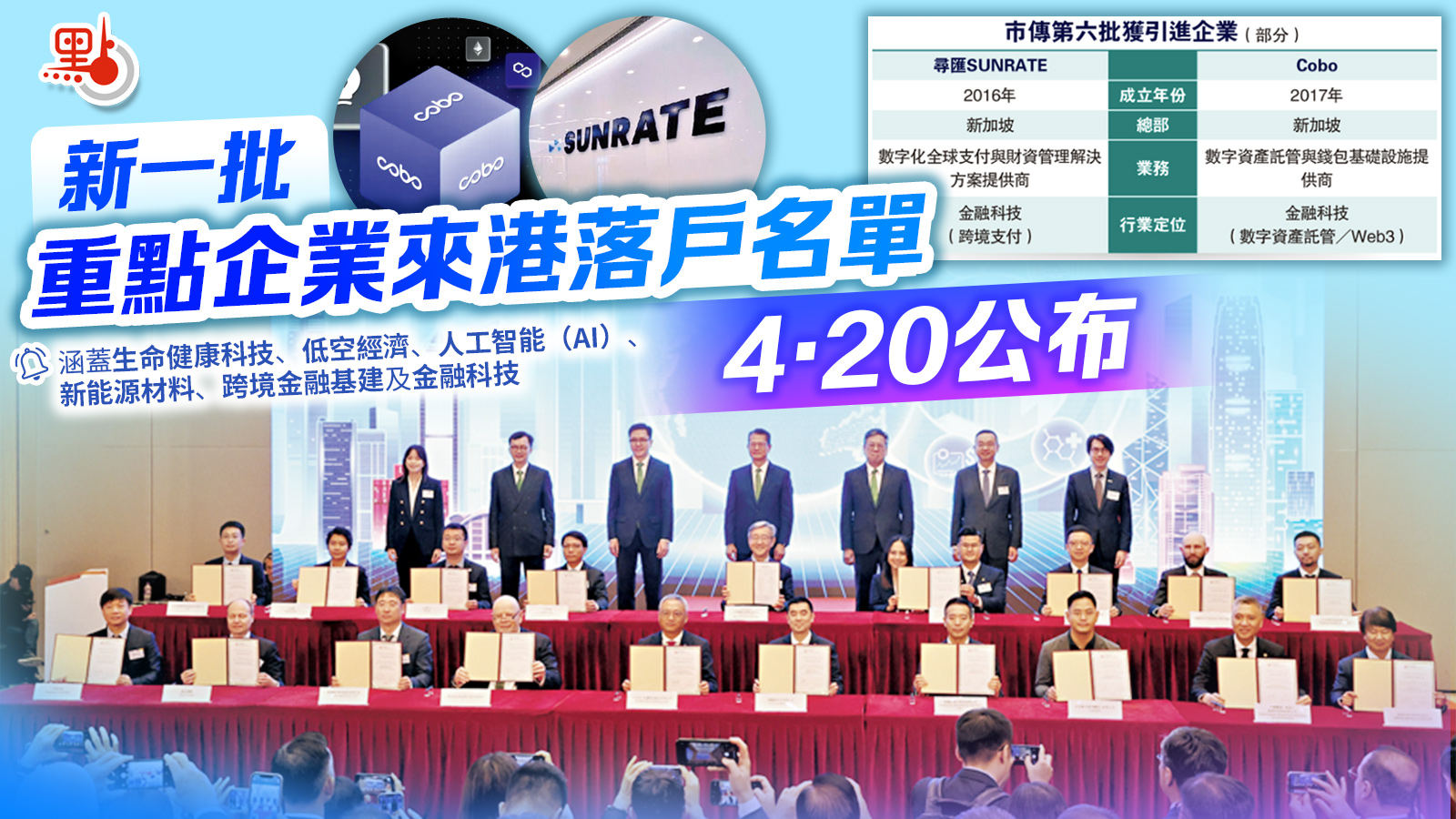據了解,兩家金融科技企業,尋匯SUNRATE及Cobo為今批重點企業之一。尋匯SUNRATE於2016年成立,總部位於新加坡,主要提供數字化全球支付及財資管理解決方案;Cobo則於2017年成立,總部同設於新加坡,主要提供數字資產託管及錢包基礎設施服務,近年亦與圓幣科技合作推動港元穩定幣HKDR應用。