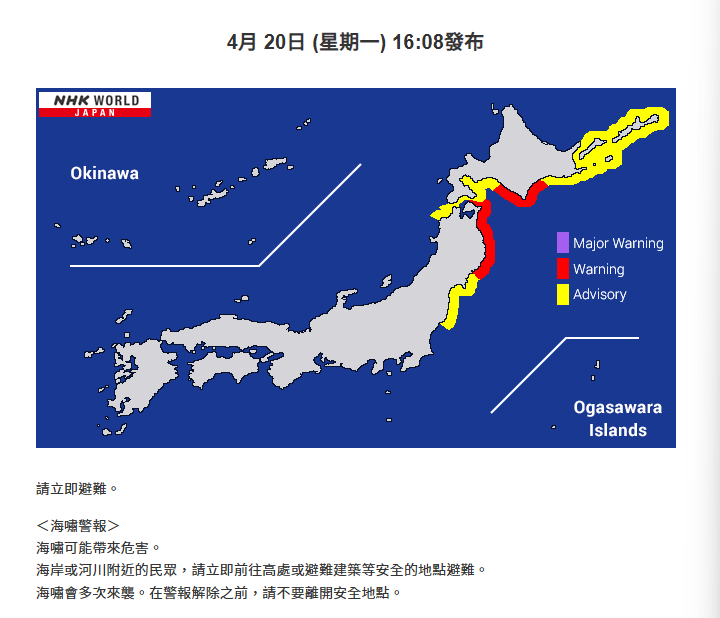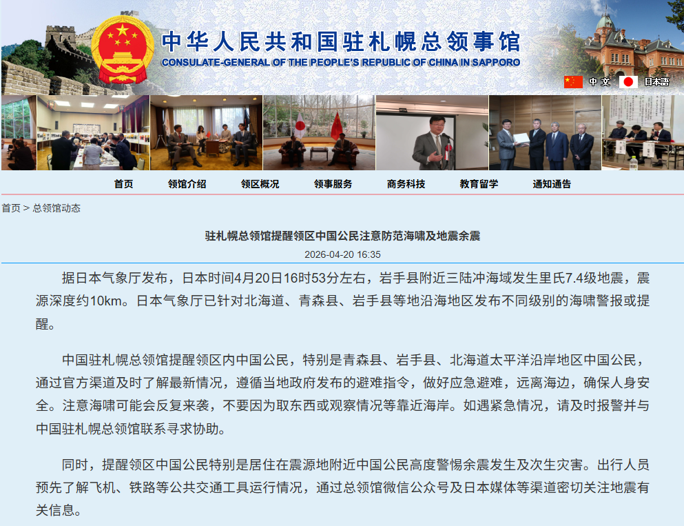中國駐日本札幌總領館4月20日提醒領區內中國公民,特別是青森縣、岩手縣、北海道太平洋沿岸地區中國公民,通過官方渠道及時了解地震最新情況,遵循當地政府發布的避難指令,做好應急避難,遠離海邊,確保人身安全。注意海嘯可能會反覆來襲,不要因為取東西或觀察情況等靠近海岸。如遇緊急情況,請及時報警並與中國駐札幌總領館聯繫尋求協助。