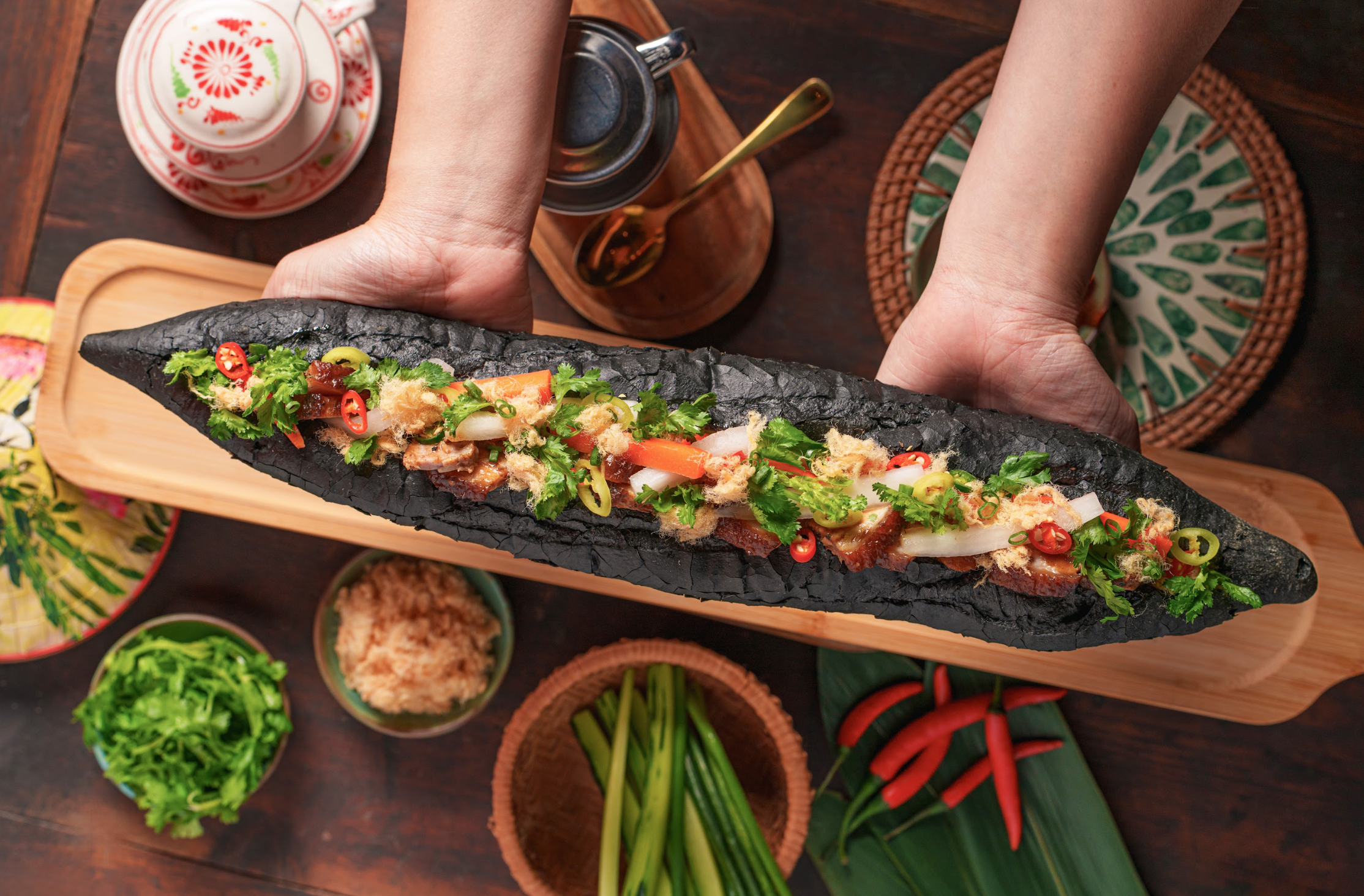 越式三文治特別選用以竹炭烘烤而成的越式法包,豐富內餡以自家製雞肝及豬肝醬、五香豬腩肉、豬肉鬆、酸菜、青蔥、香菜、辣椒及越式蛋黃醬層層堆疊,另澆上點點魚露提鮮,細緻演繹法越風情。為確保最佳體驗,建議賓客至少提前24小時訂座並預訂此一餐點。食客凡點選「20吋竹炭越式三文治」可以優惠價港幣28元品味正宗越南風味咖啡或茶(原價為港幣55元至60元)。咖啡包括經典煉奶咖啡、黑咖啡、凍椰子咖啡、海鹽咖啡;另有暖心活力茶。