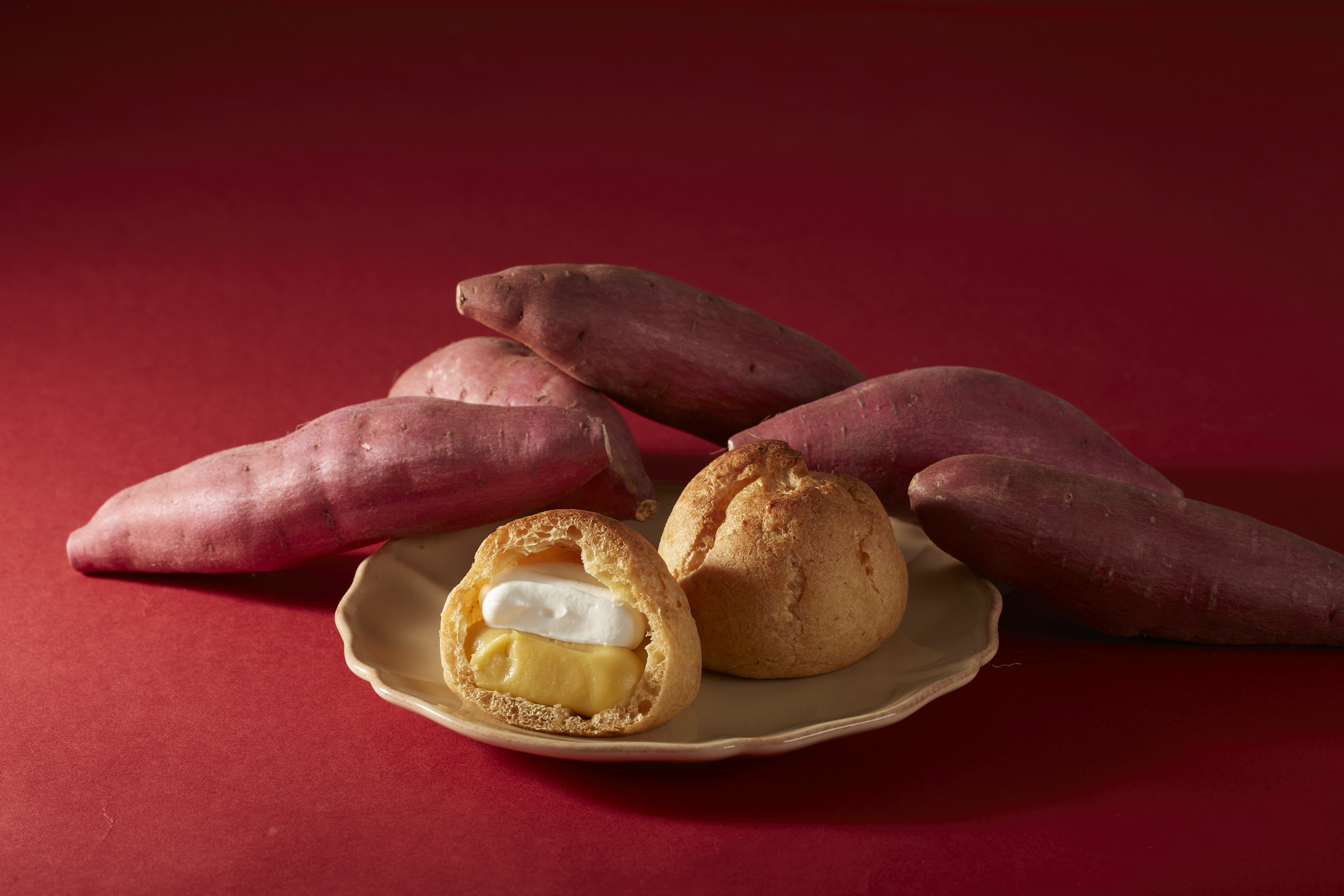 雙味泡芙(烤蕃薯及忌廉):嚴選香甜濃郁烤蕃薯製作而成的烤蕃薯風味的吉士忌廉,質地綿密柔滑,帶着焦糖般的蜜香。