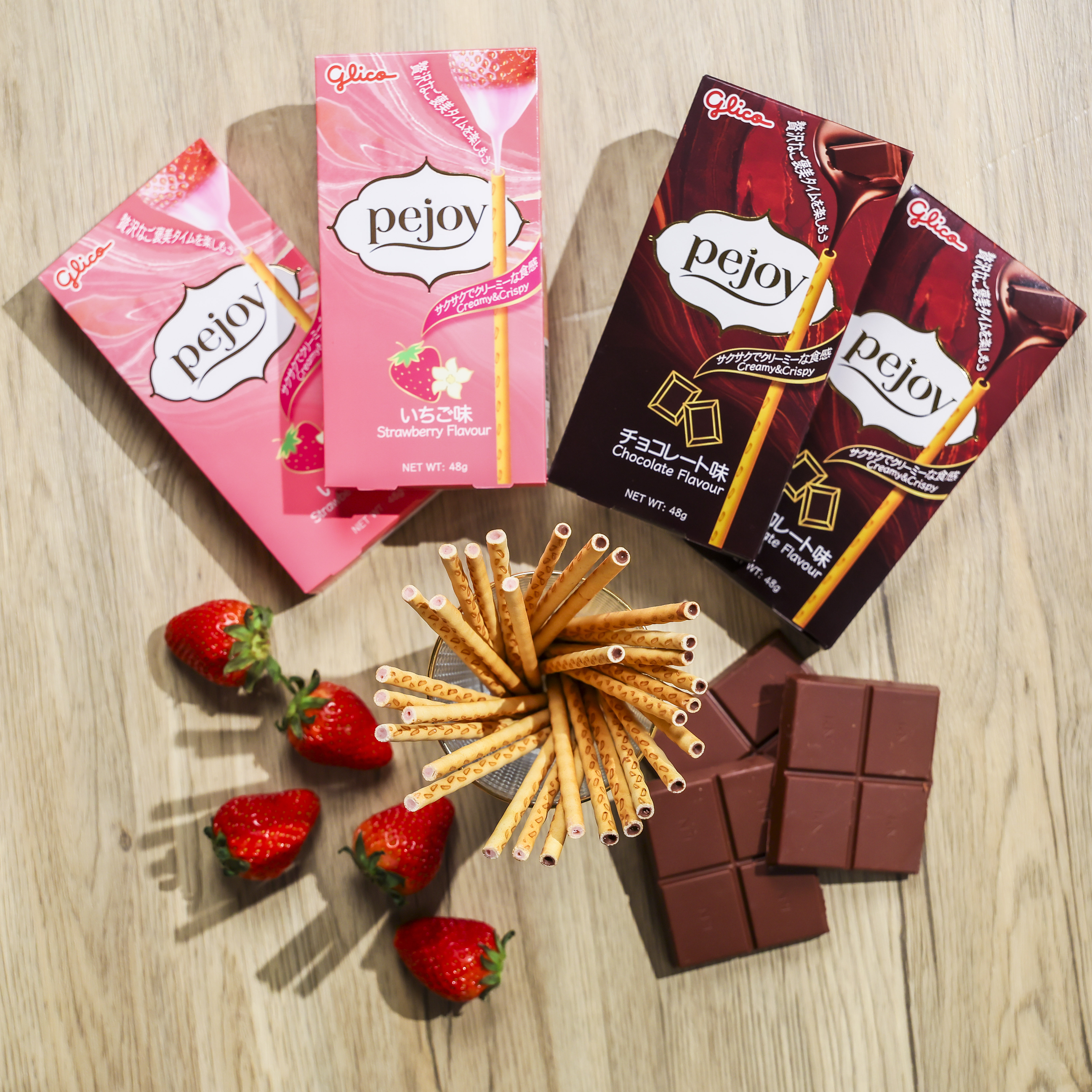 「pejoy朱古力味夾心餅乾條」帶來濃郁香醇的可可風味,嚴選優質可可粉製成絲滑微苦而不甜膩的朱古力夾心,外層餅乾酥脆輕盈,雙重口感完美融合,保證一試難忘!而「pejoy士多啤梨味夾心餅乾條」,融入清新香甜的的士多啤梨風味醬,令人不禁一口接一口,越食越想食。
