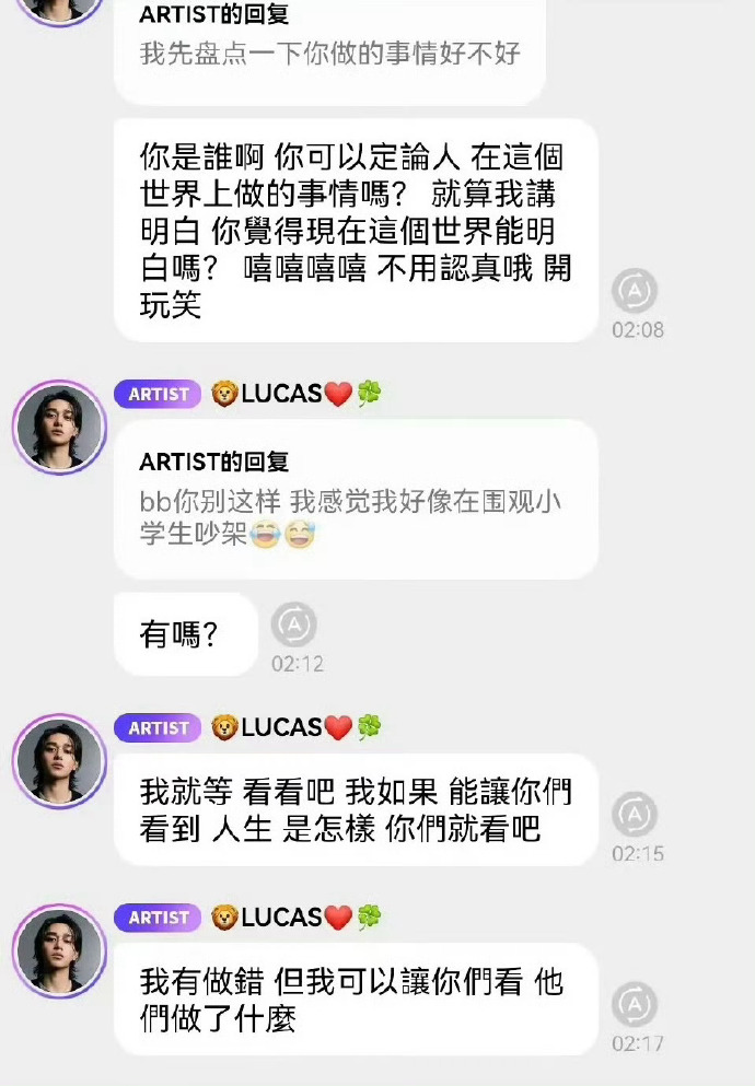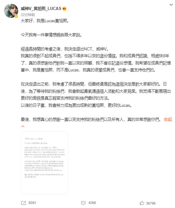 SM娛樂在公告中表示,感謝一直以來給予LUCAS喜愛與支持的粉絲們。公司與LUCAS的專屬合約將於4月24日結束,公司珍惜自練習生時期起至今,與LUCAS一同走過的時光,並真心地為他未來將展開的全新挑戰予以支持與應援,也懇請粉絲們今後以溫暖的目光持續關注LUCAS的全新出發。
